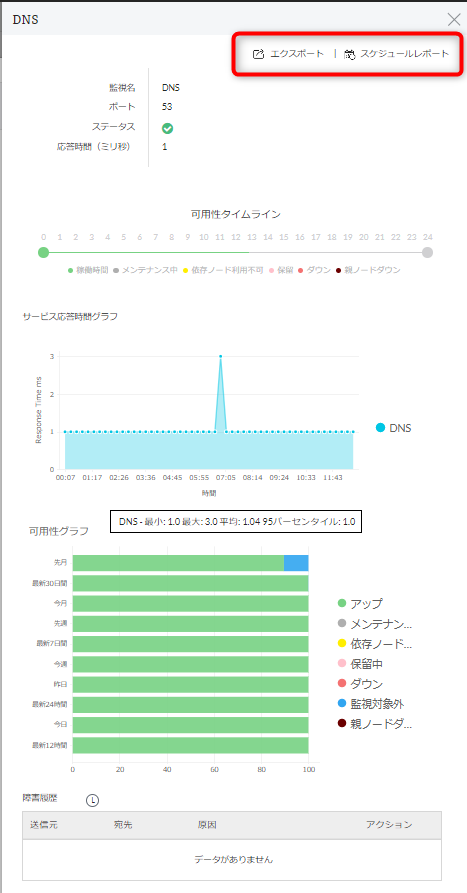 右上の[エクスポート]をクリックし、PDF形式またはExcel形式でエクスポートします。PDF形式ではグラフが、Excel形式ではテーブルデータがエクスポートされます。スケジュールレポート出力
