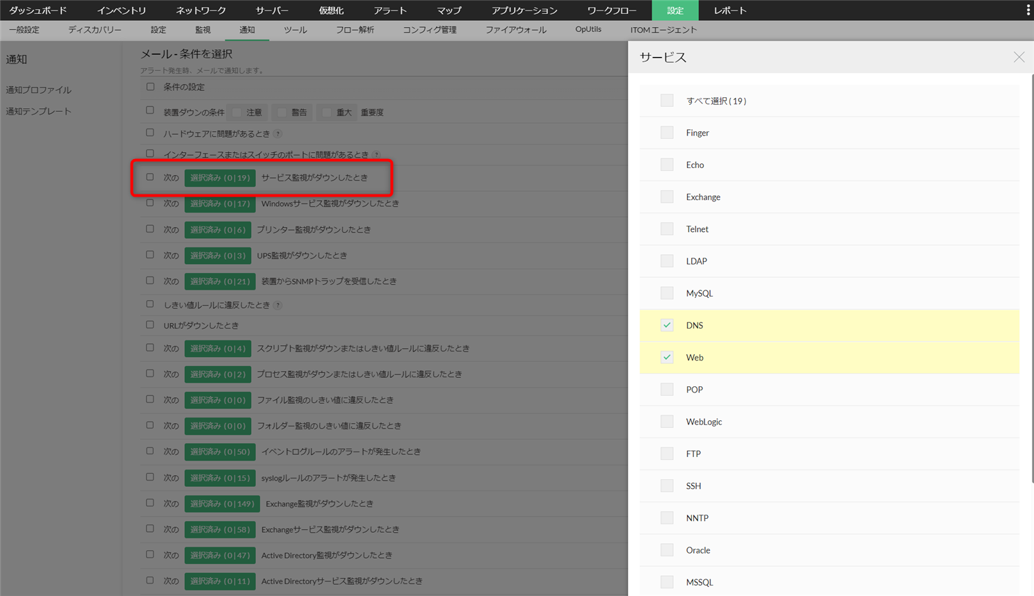 [サービス監視がダウンしたとき]、通知対象とするTCPサービス名、通知を行う重要度で[サービスダウン]を選択します。