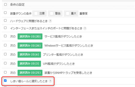 [しきい値ルールに違反したとき]、通知を行う重要度で、しきい値設定で設定した重要度のうち通知したい重要度を選択します。