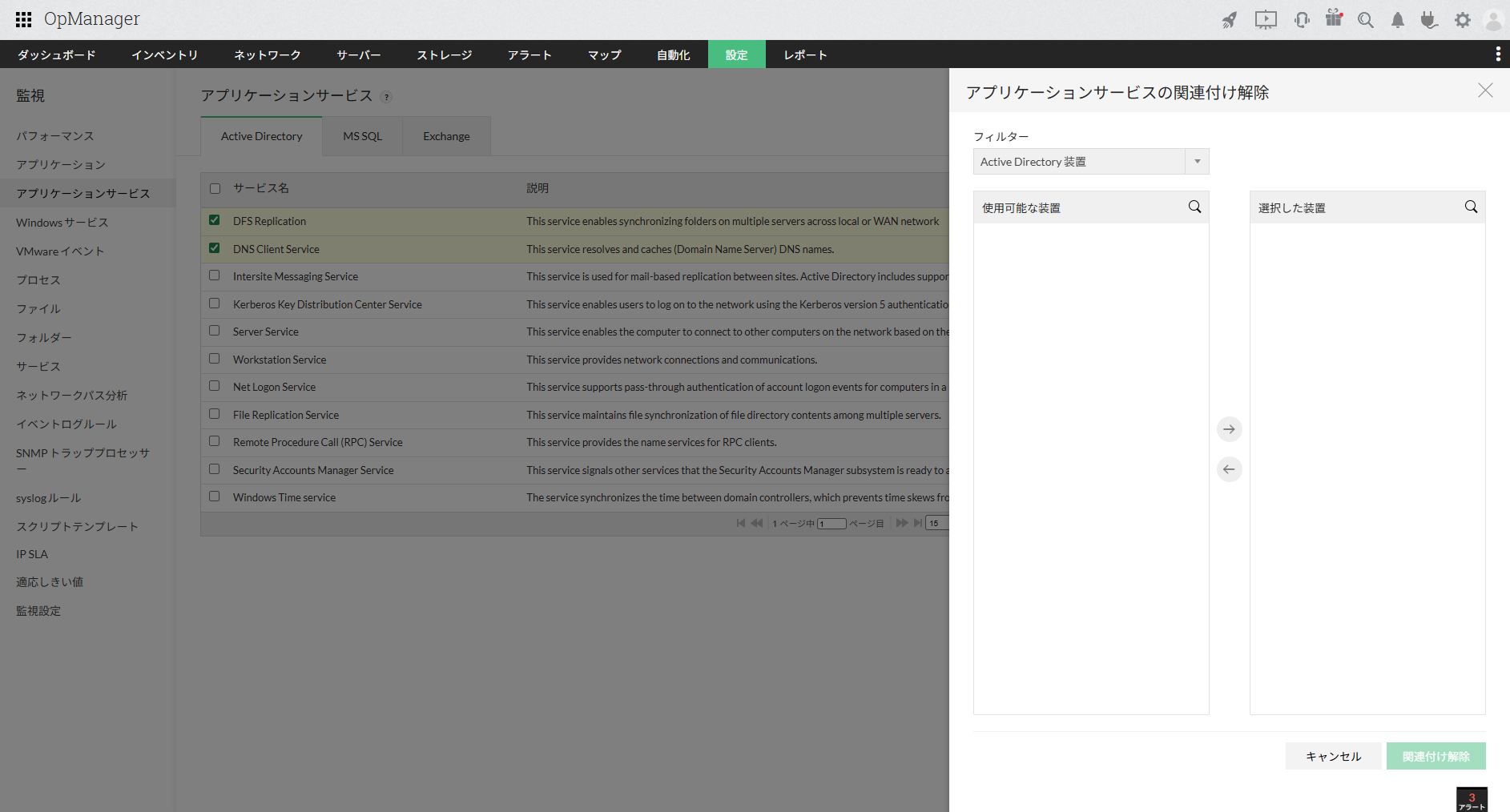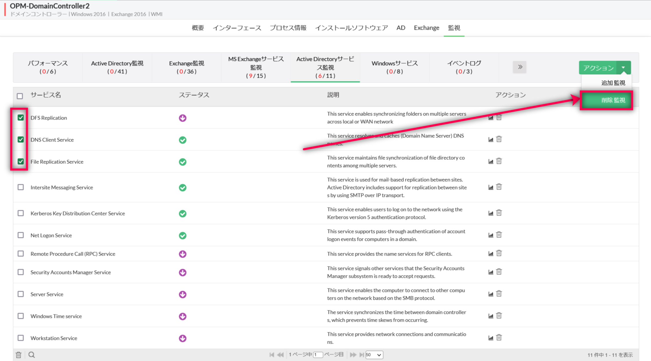 Active Directoryのサービス監視を削除するには、以下の手順を実施します。