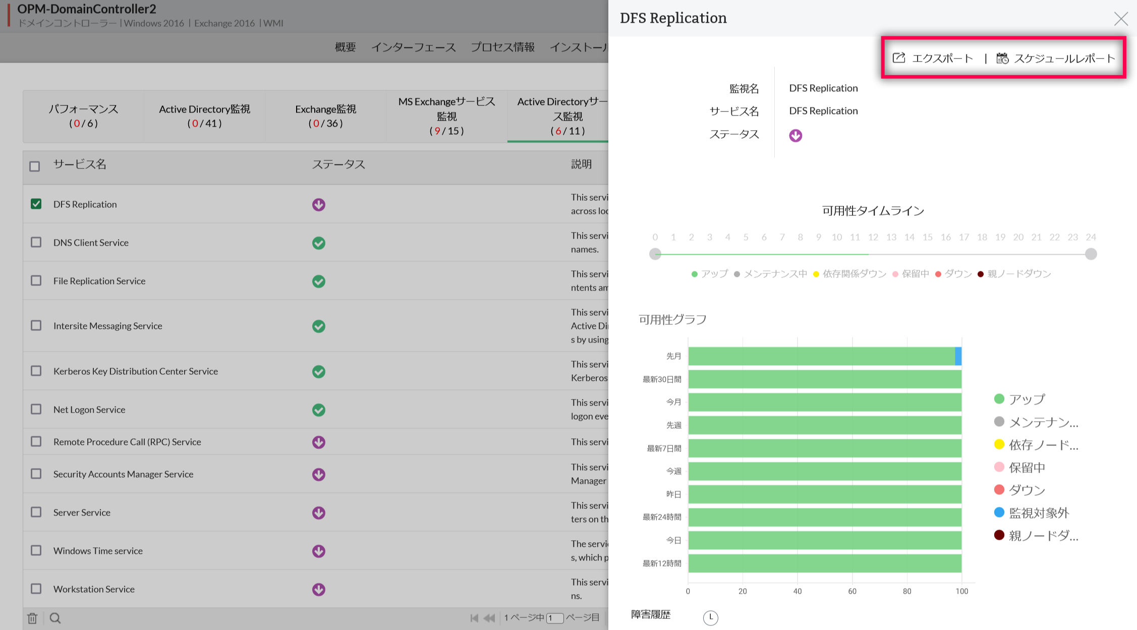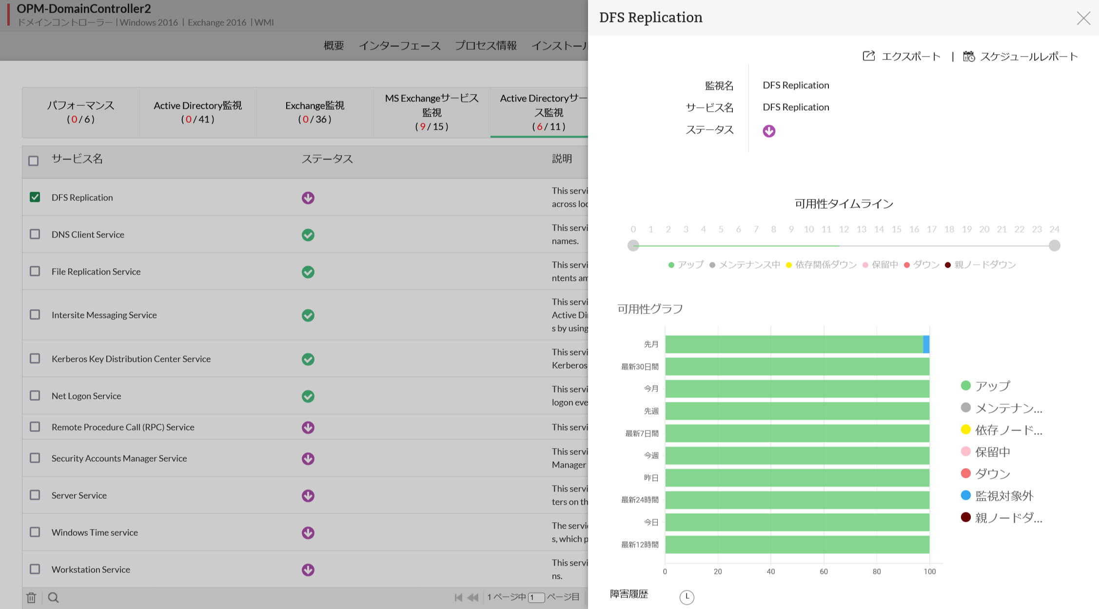 Active Directoryのサービス監視の可用性に関する履歴データは、グラフまたはレポートで閲覧することができます。