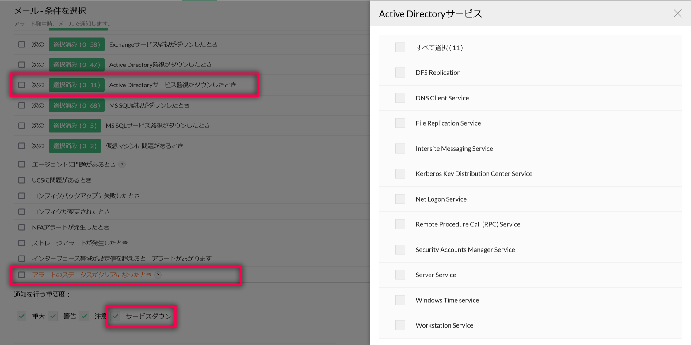 - [通知を行う重要度]で、[サービスダウン]をチェックします。
