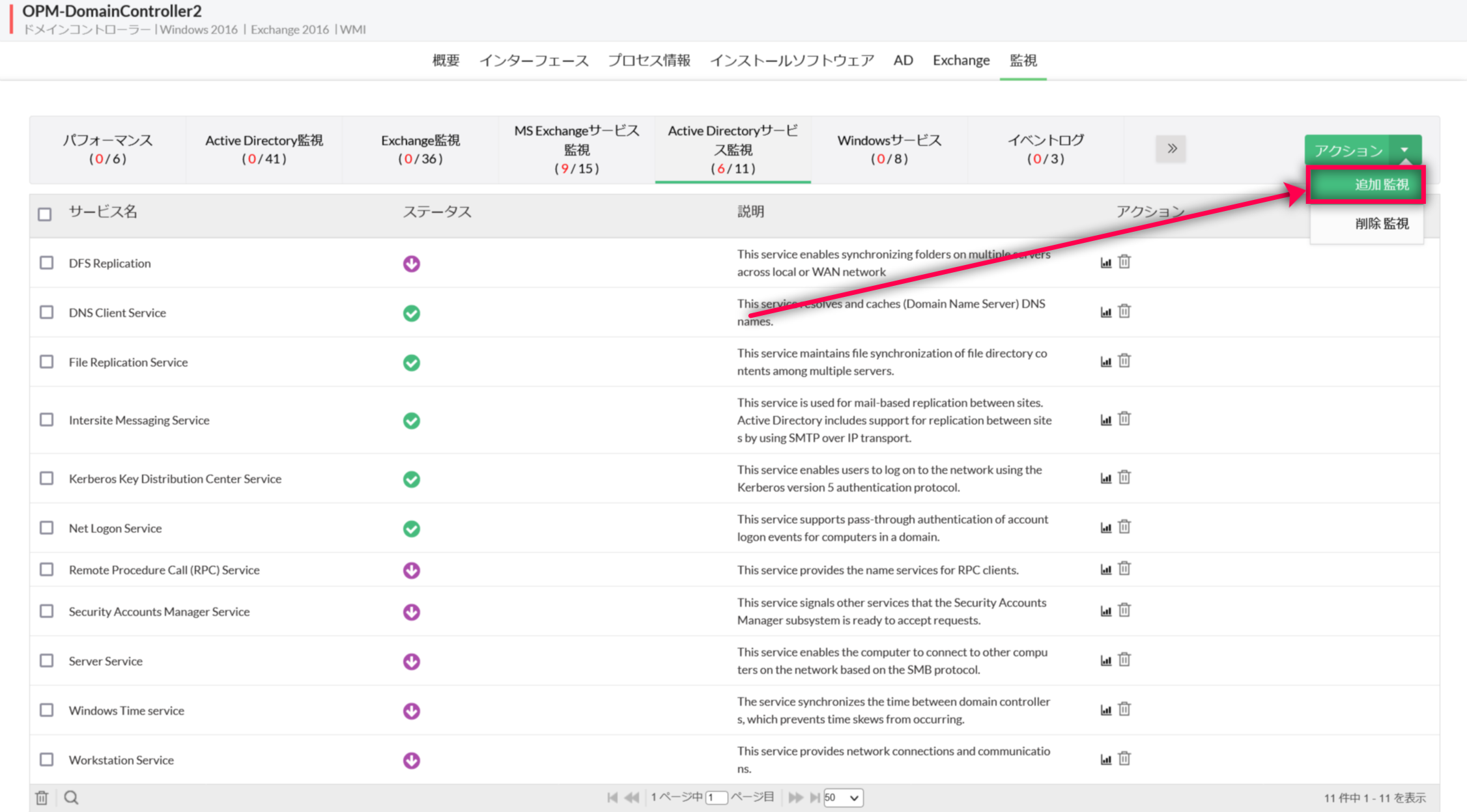 Active Directoryのサービス監視の追加方法は以下の通りです。装置ごとに追加