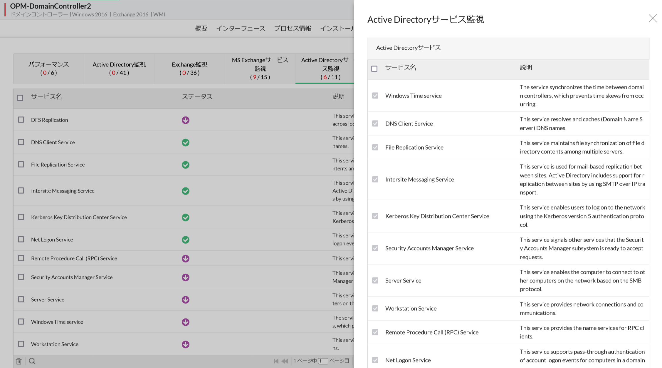 WMIの認証情報を通して、ドメインコントローラーで稼働するActive Directoryに関連するWindowsサービスの稼働状況を監視することができます。