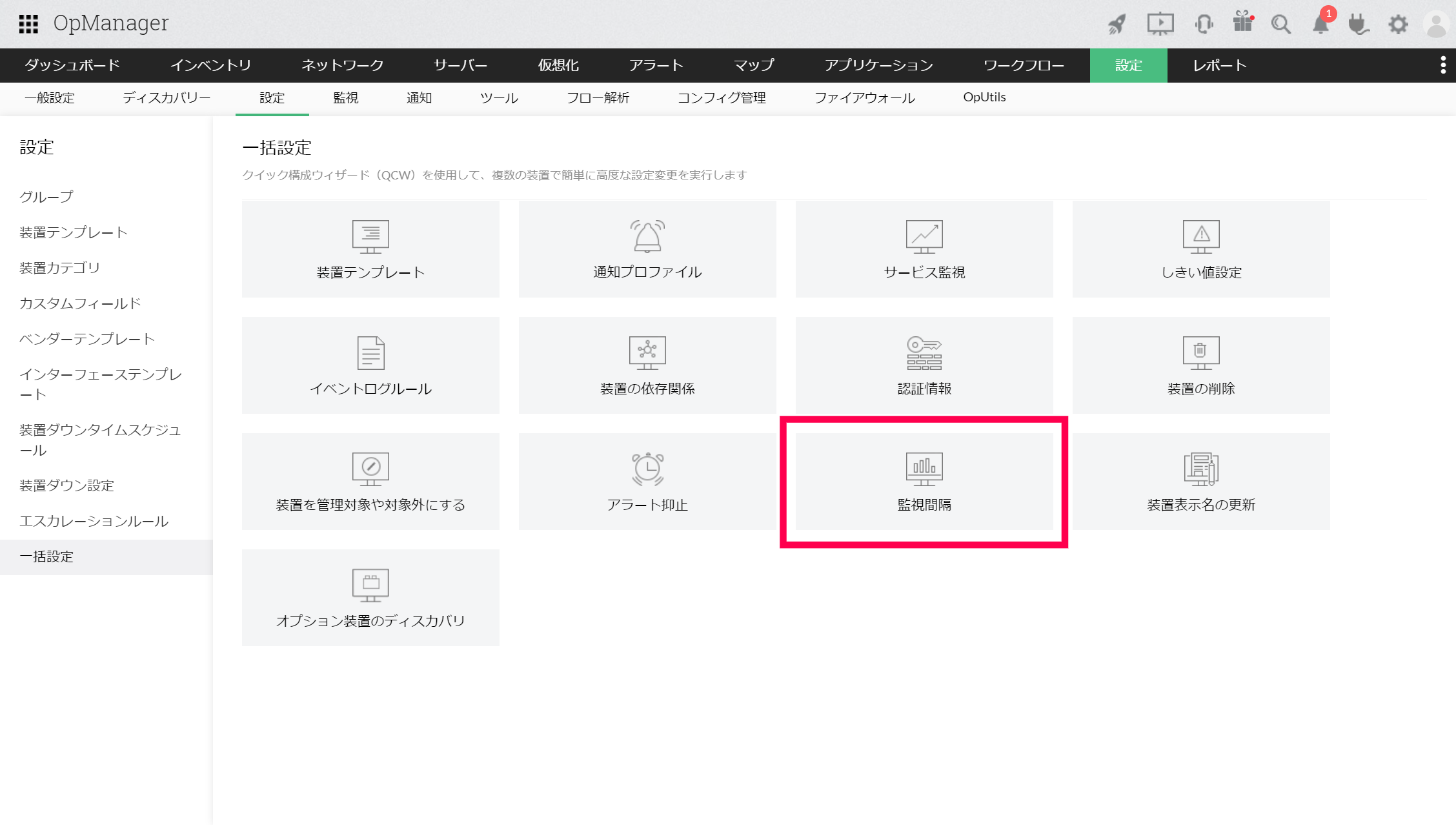 装置カテゴリに設定されている監視間隔の確認および変更方法は以下の通りです。
