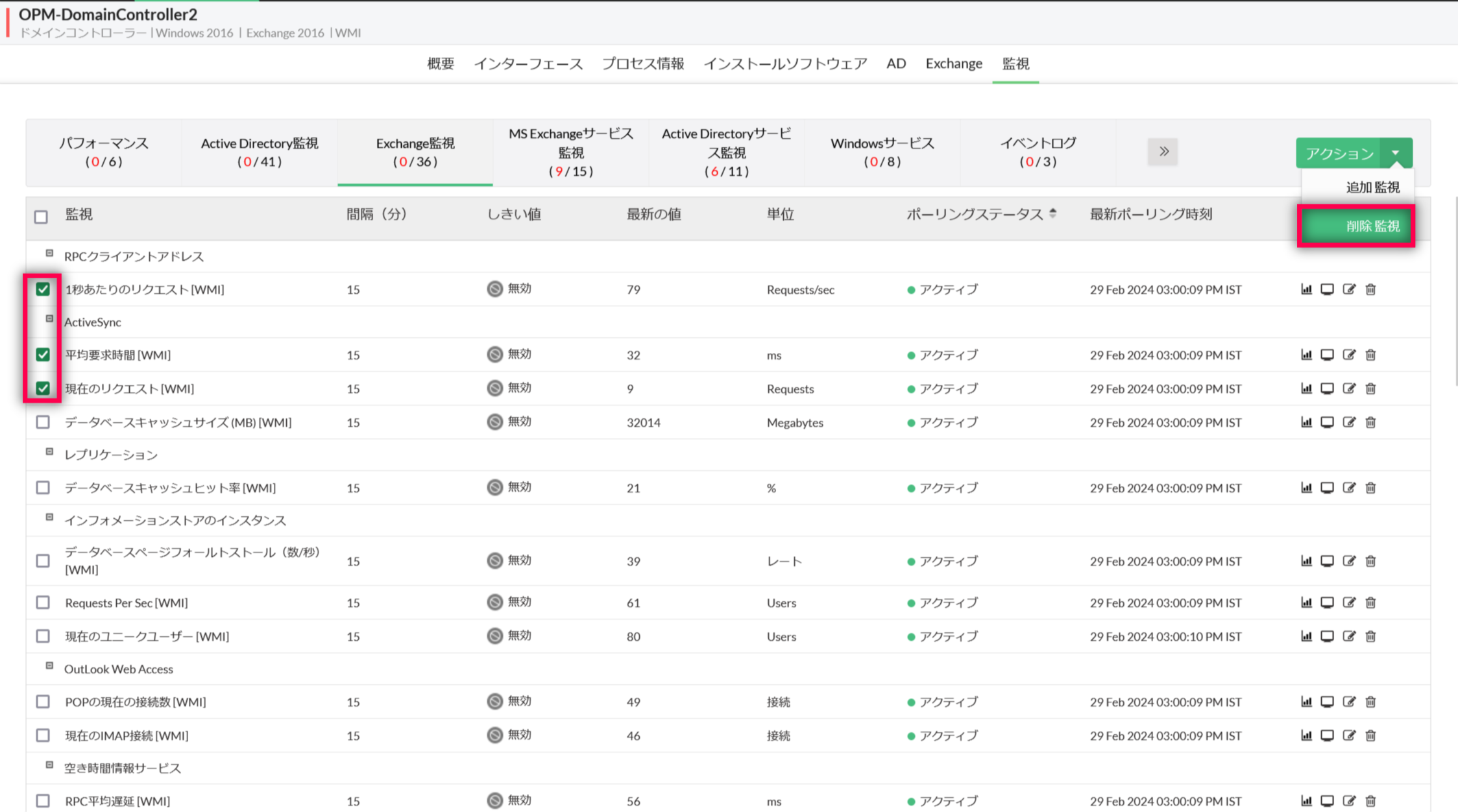 Exchangeのパフォーマンス監視を削除するには、以下の手順を実施します。