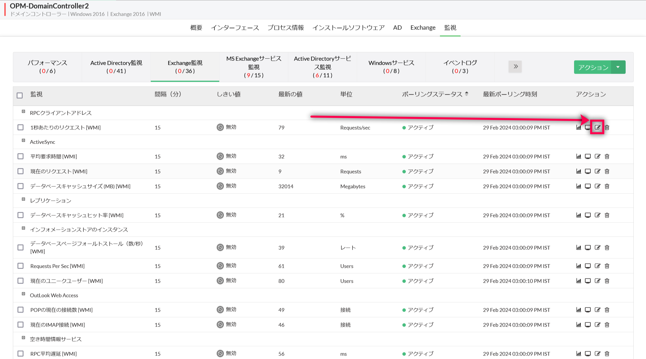 装置に追加したExchangeのパフォーマンス監視の監視間隔またはしきい値を編集するには、以下の手順を実施します。
