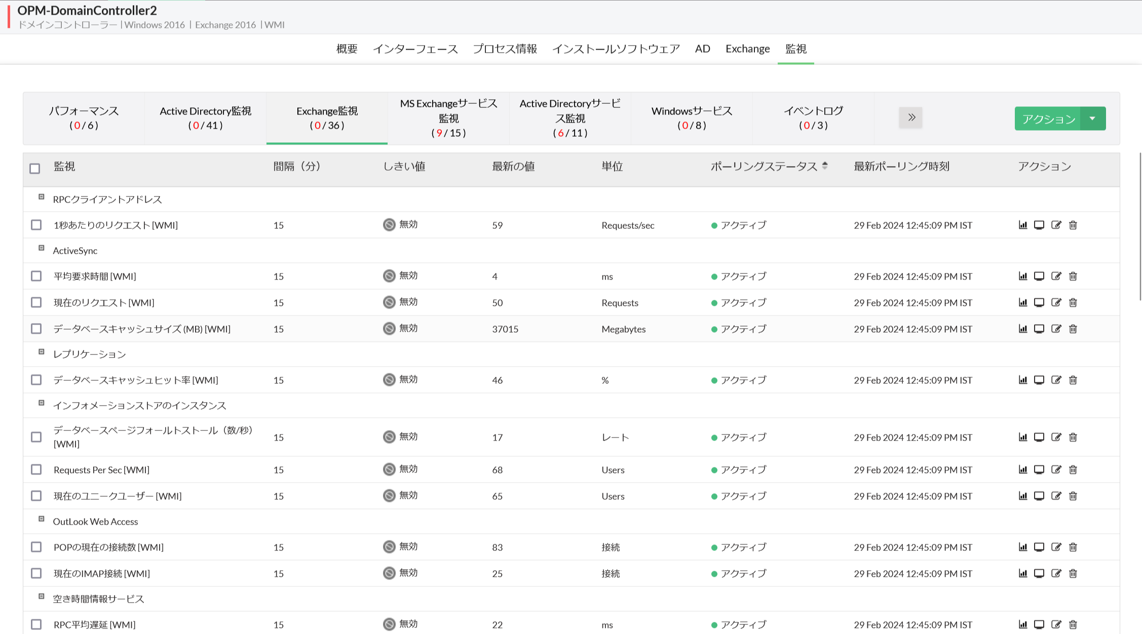 WMIの認証情報を通して、Windows Server上で稼働するExchangeの各種パフォーマンスを監視できます。