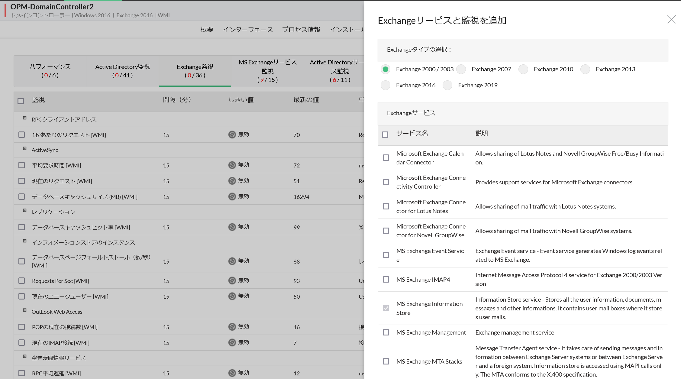 追加できる監視項目の一覧が表示されます。 - [Exchangeタイプの選択]から、監視するExchangeのバージョンを選択します。