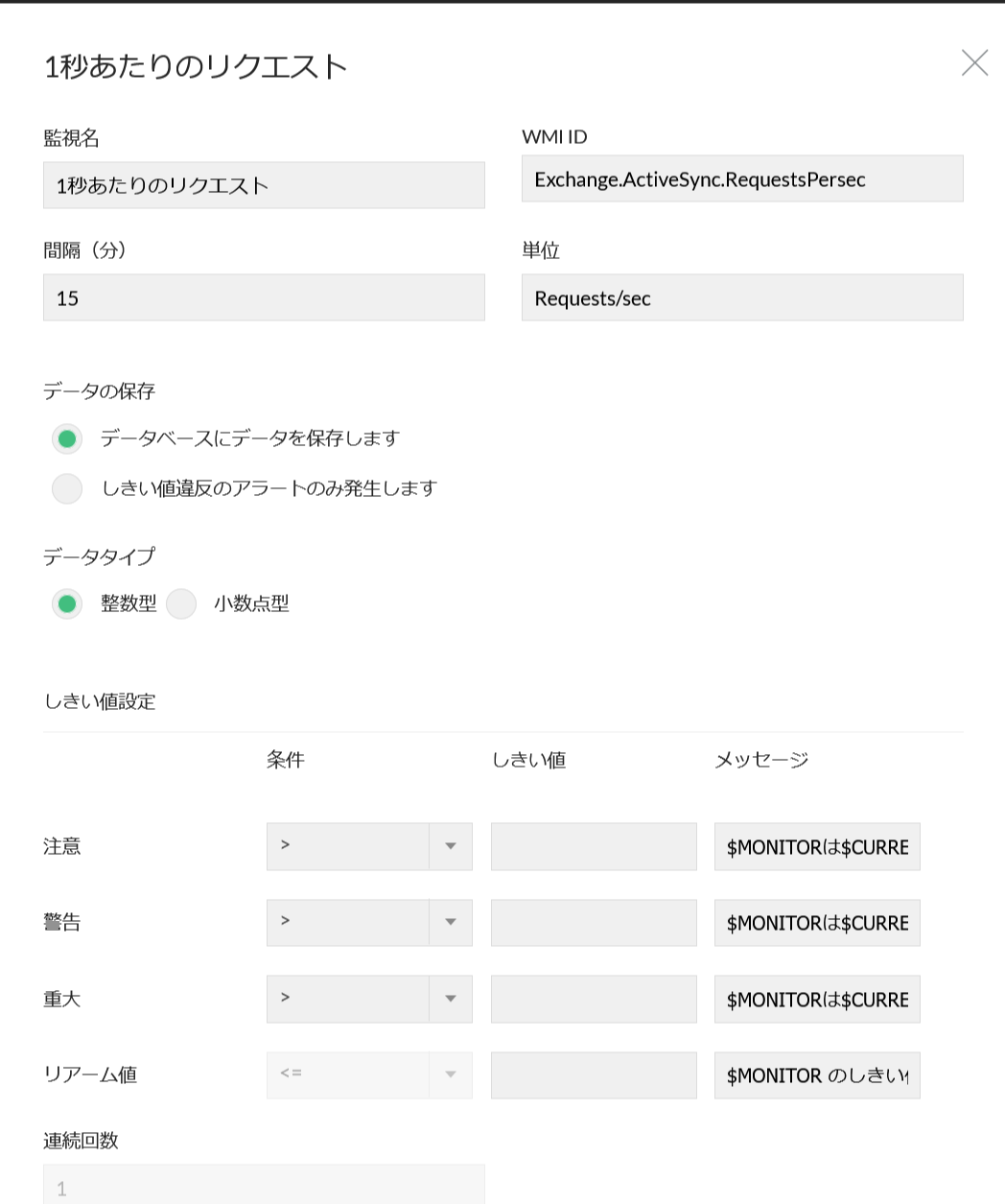 アラートが発生している状態でリアーム値に指定した条件を満たすと、アラートがクリアされます。しきい値 それぞれの重要度のアラートが発生する条件となるしきい値を入力します。 メッセージ アラートの本文(メッセージ)を必要に応じて編集します。 連続回数 アラートが発生するまでの連続したしきい値違反の回数を指定します。