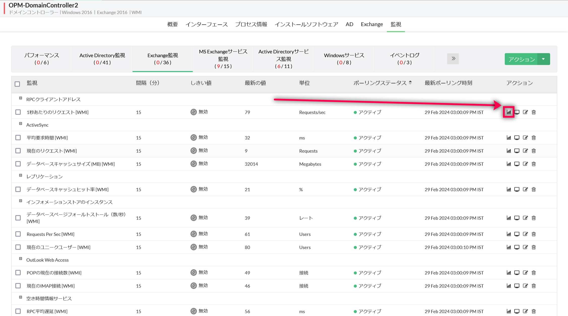 装置に追加したExchangeのパフォーマンス監視のグラフは、以下の手順で確認できます。