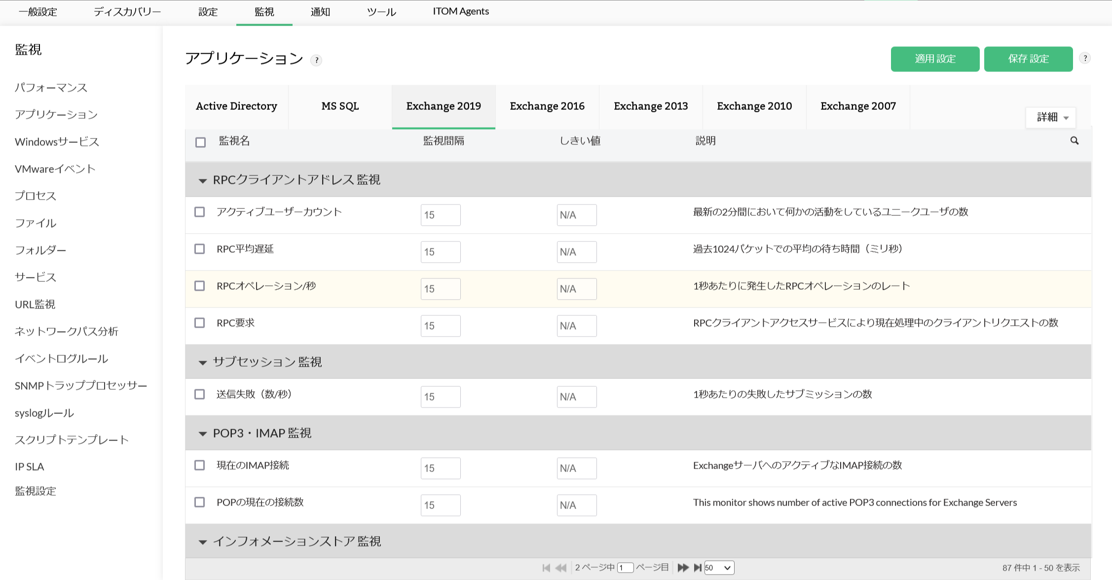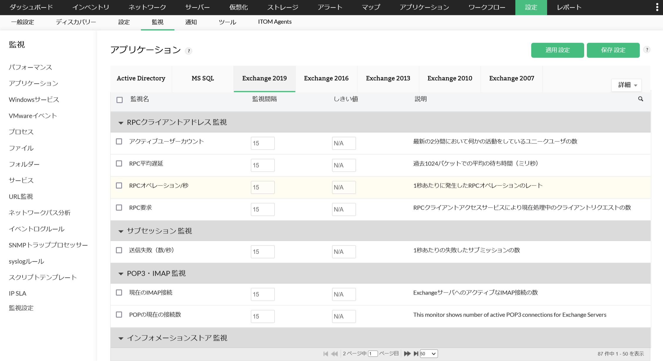 Exchange 2016以前のバージョンに対応する監視項目は、[設定]→[監視]→[アプリケーション]→[Exchange (バージョンの数字)]からご確認ください。