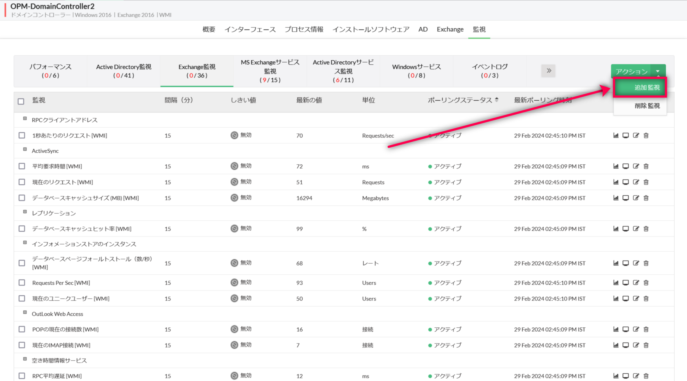 Exchangeのパフォーマンス監視の追加方法は以下の通りです。