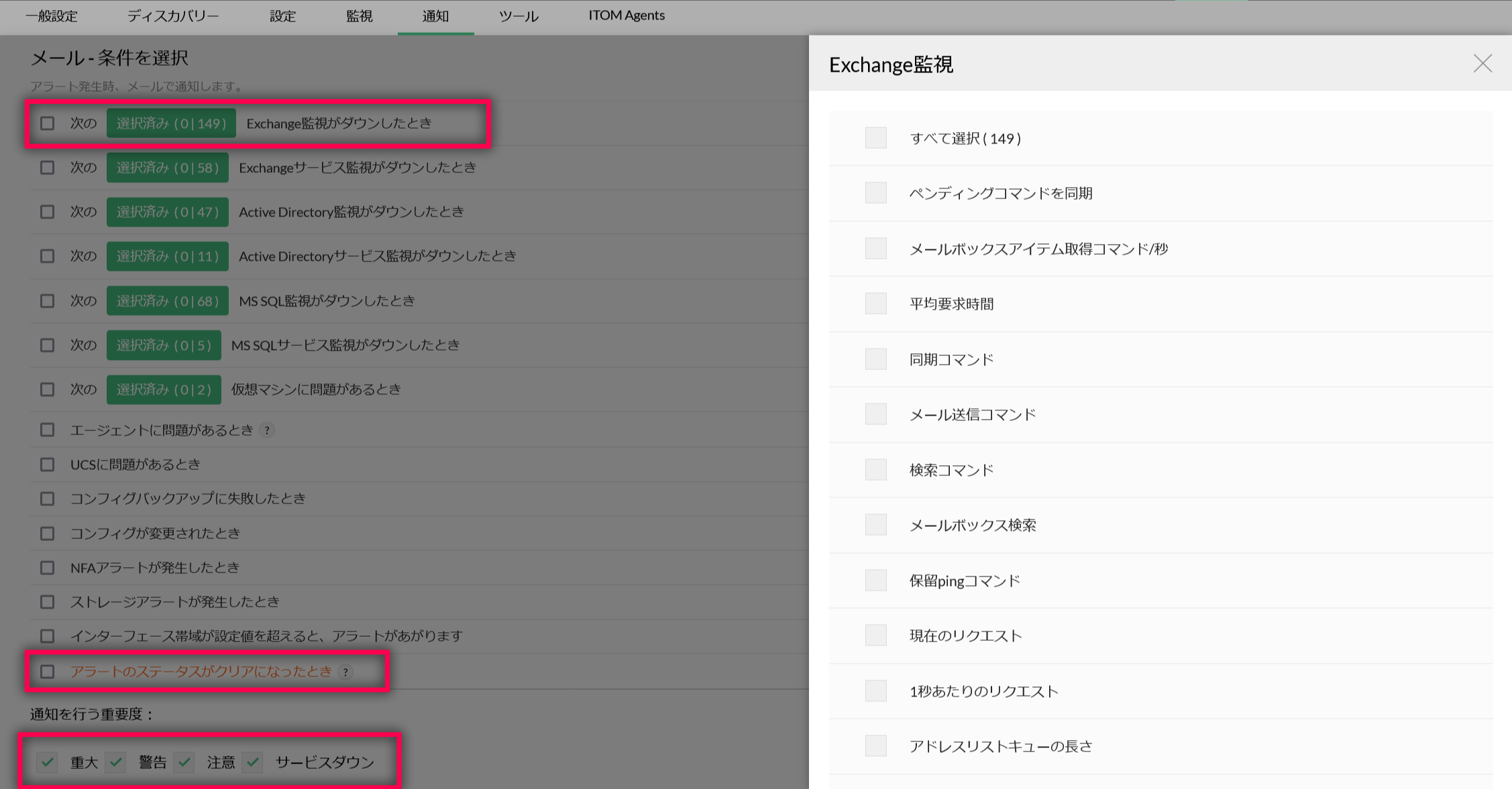 - [次のExchange監視がダウンしたとき]の[選択済み]から、しきい値違反を通知する監視をチェックして[完了]をクリックします。