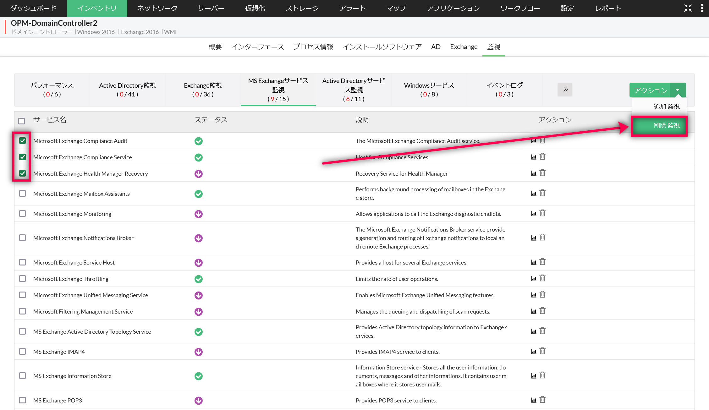 Exchangeのサービス監視を削除するには、以下の手順を実施します。