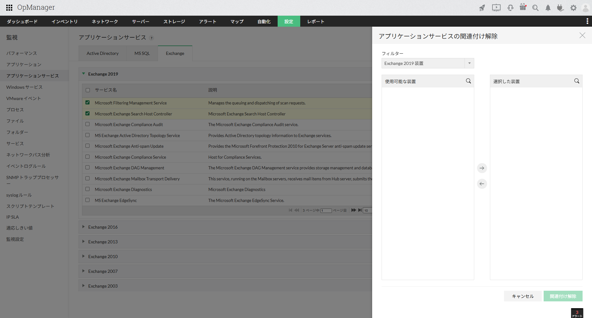 - [設定]→[監視]→[アプリケーションサービス]の[Exchange]タブに移動します。