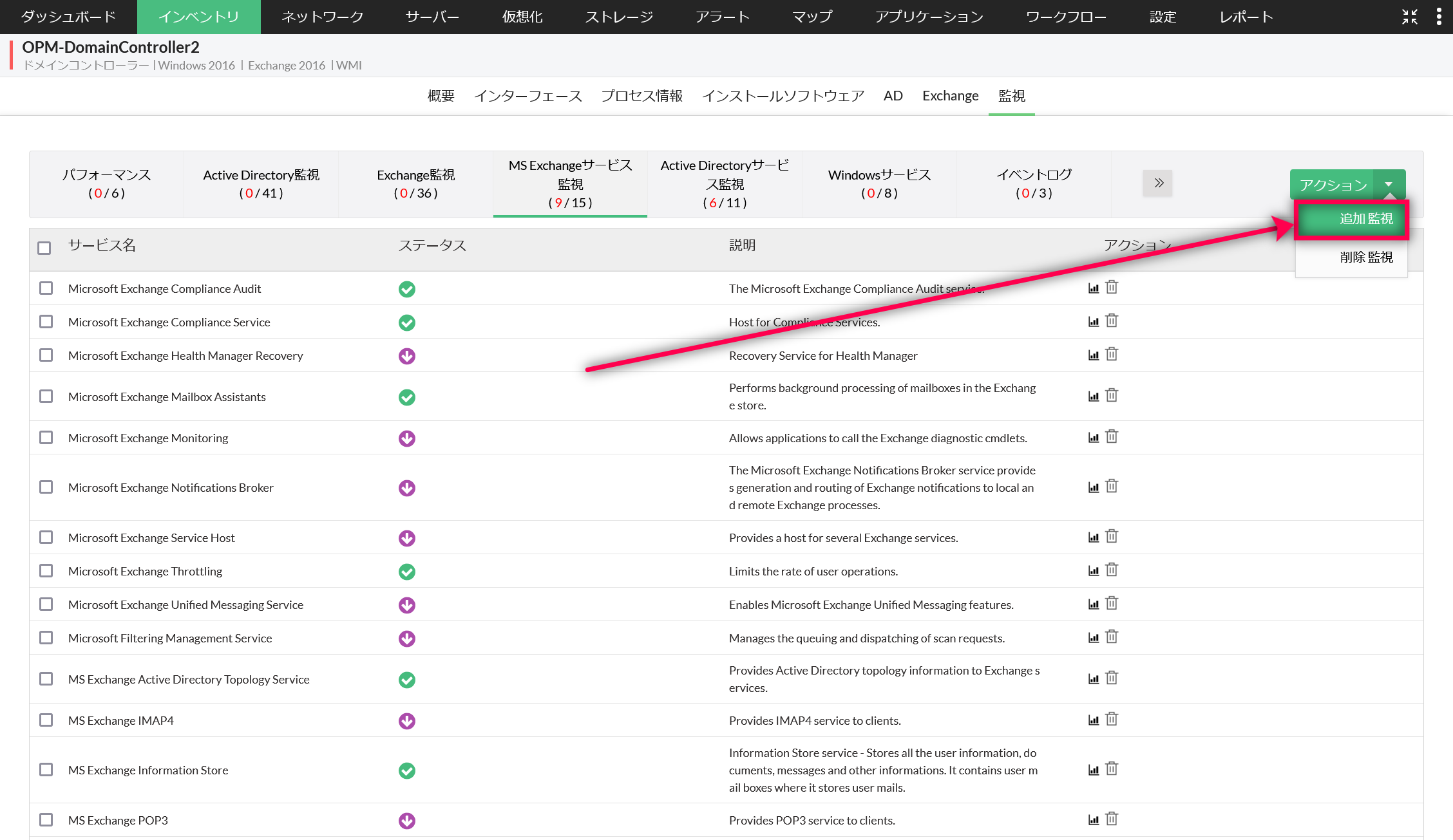 - [監視]→[MS Exchangeサービス監視]に移動します。