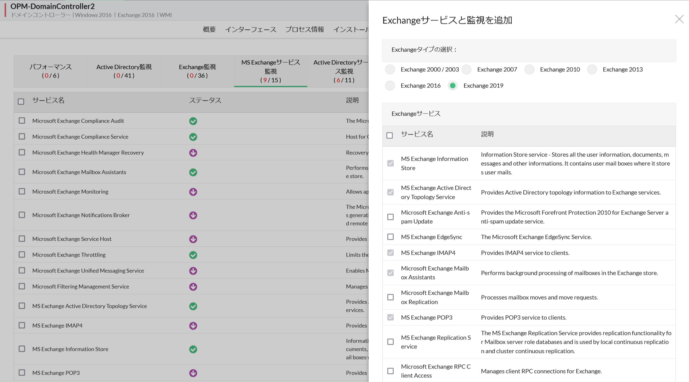 - 追加するExchangeサービス監視にチェックを入れます。