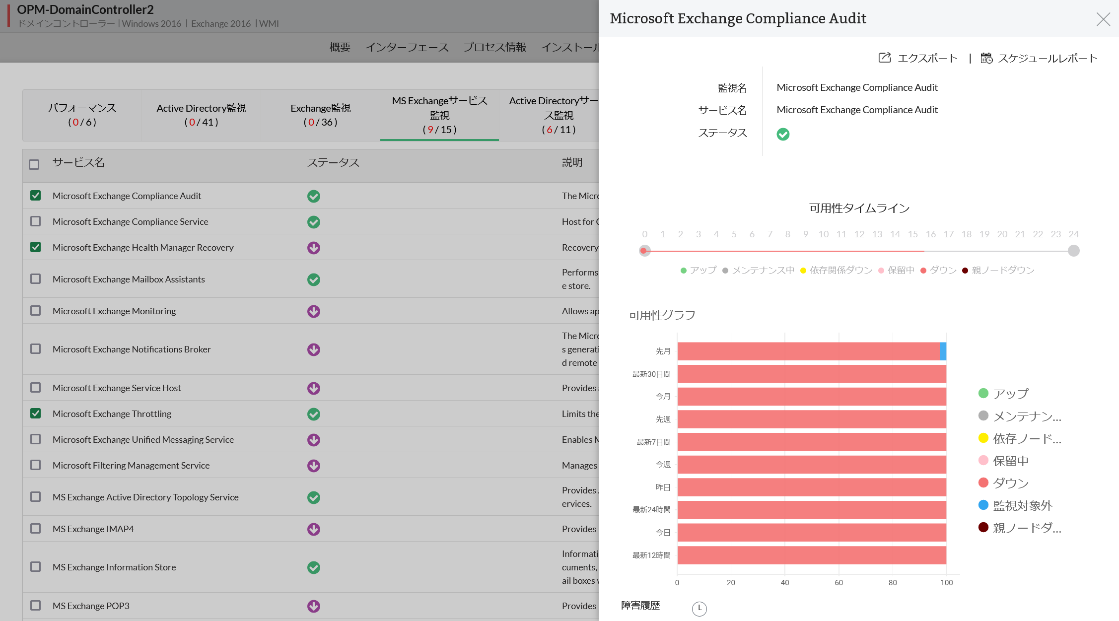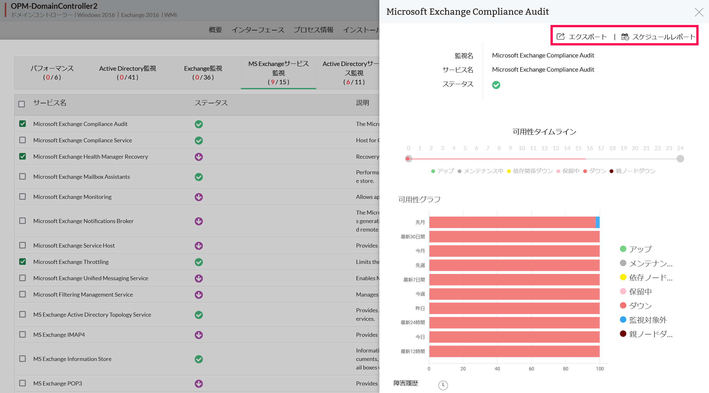 Exchangeのサービス監視の可用性に関する履歴データは、グラフまたはレポートで閲覧することができます。