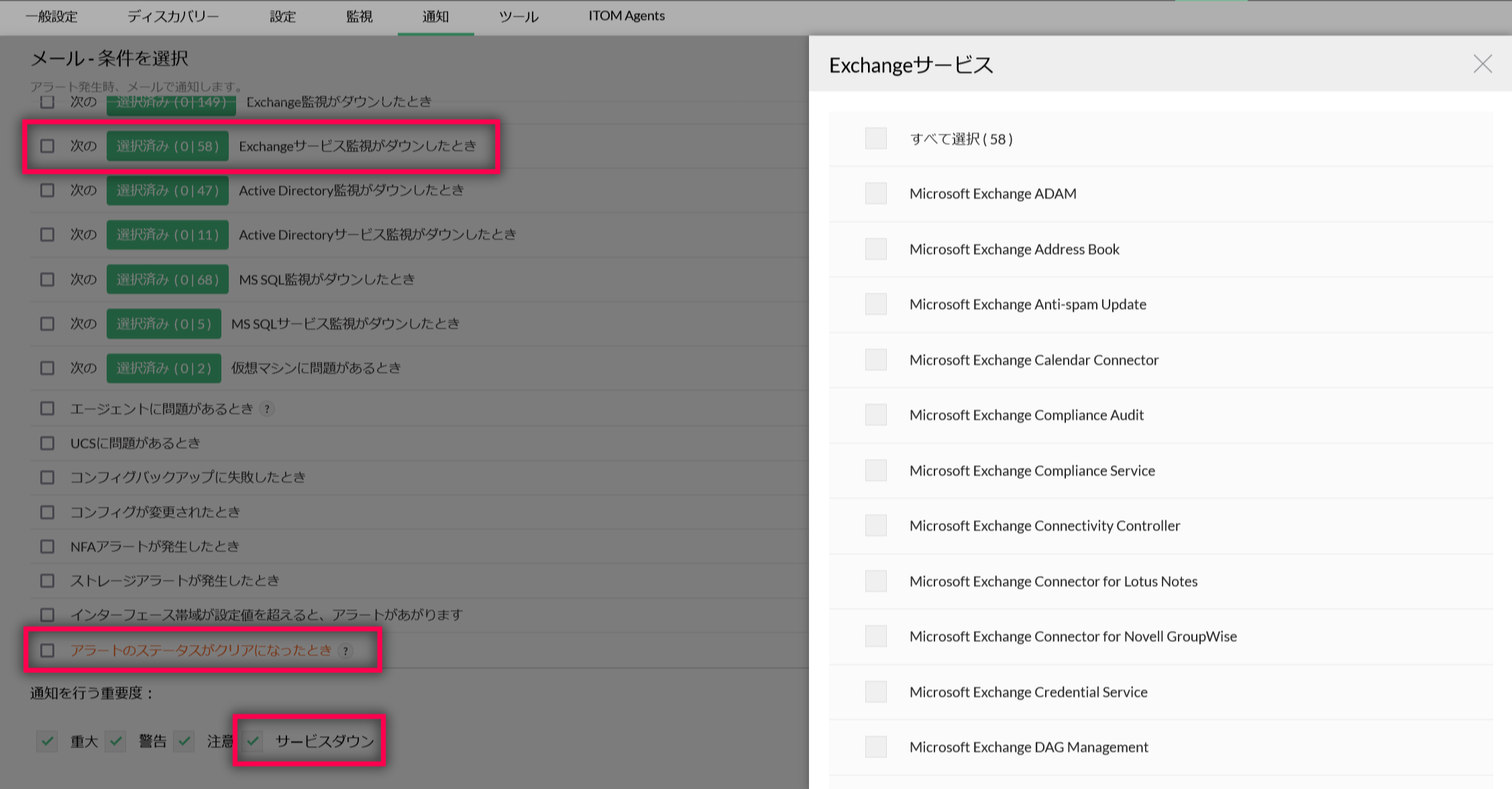 - [次のExchangeサービス監視がダウンしたとき]の[選択済み]から、ダウンを通知する監視をチェックして[完了]をクリックします。