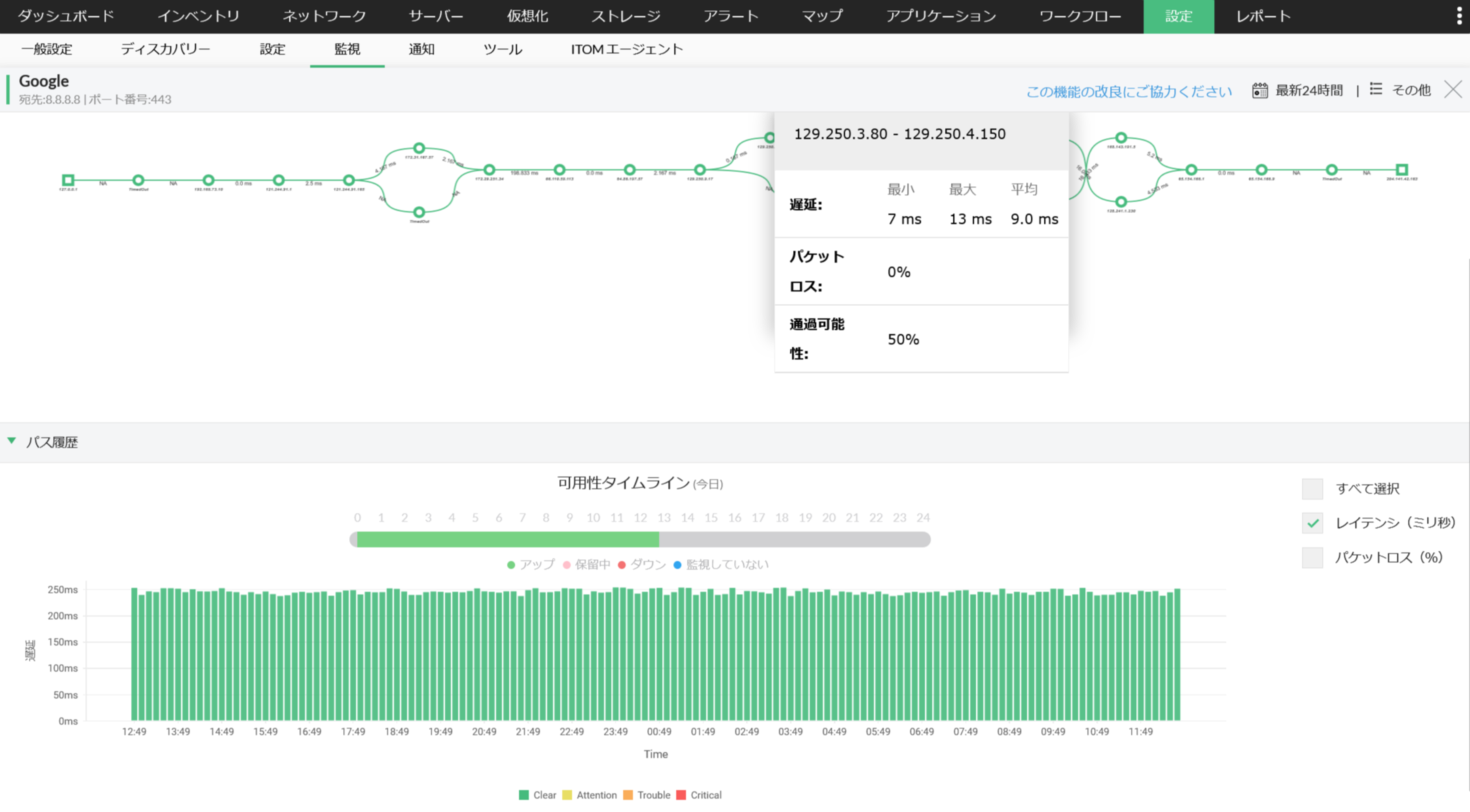 画面下部のパス履歴には、ネットワークパス全体の可用性及びレイテンシ(遅延)、パケットロスの履歴が表示されます。