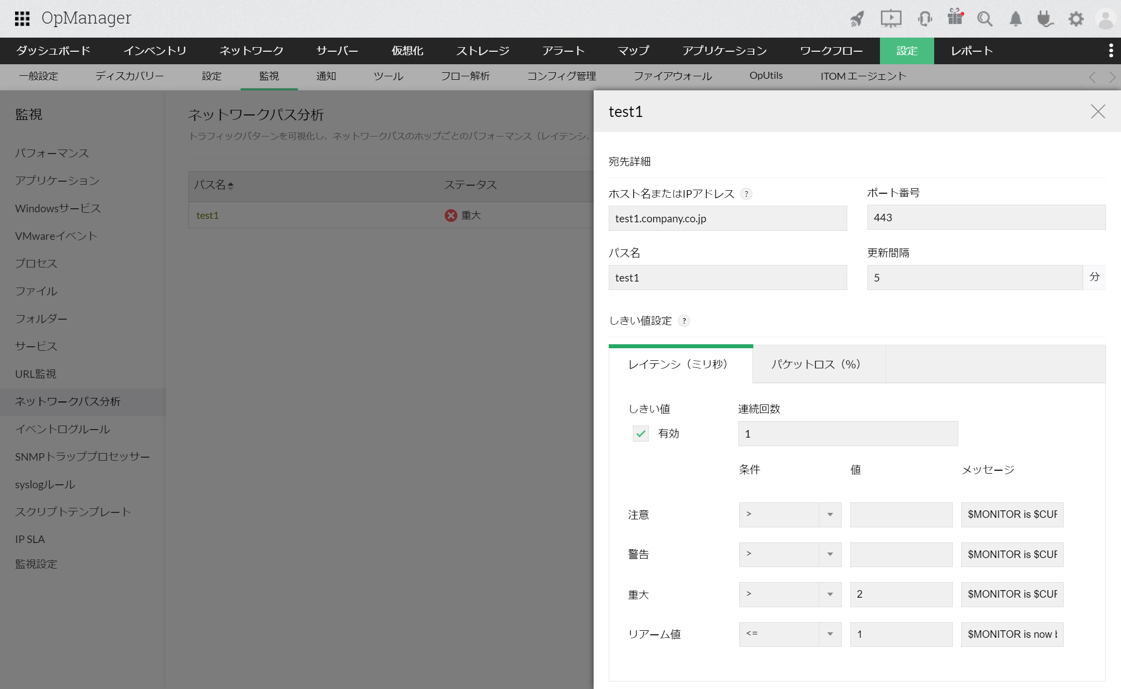 ネットワークパスのレイテンシ(遅延)とパケットロスに対してはしきい値設定が可能であり、設定されたしきい値に応じてアラートを発報します。