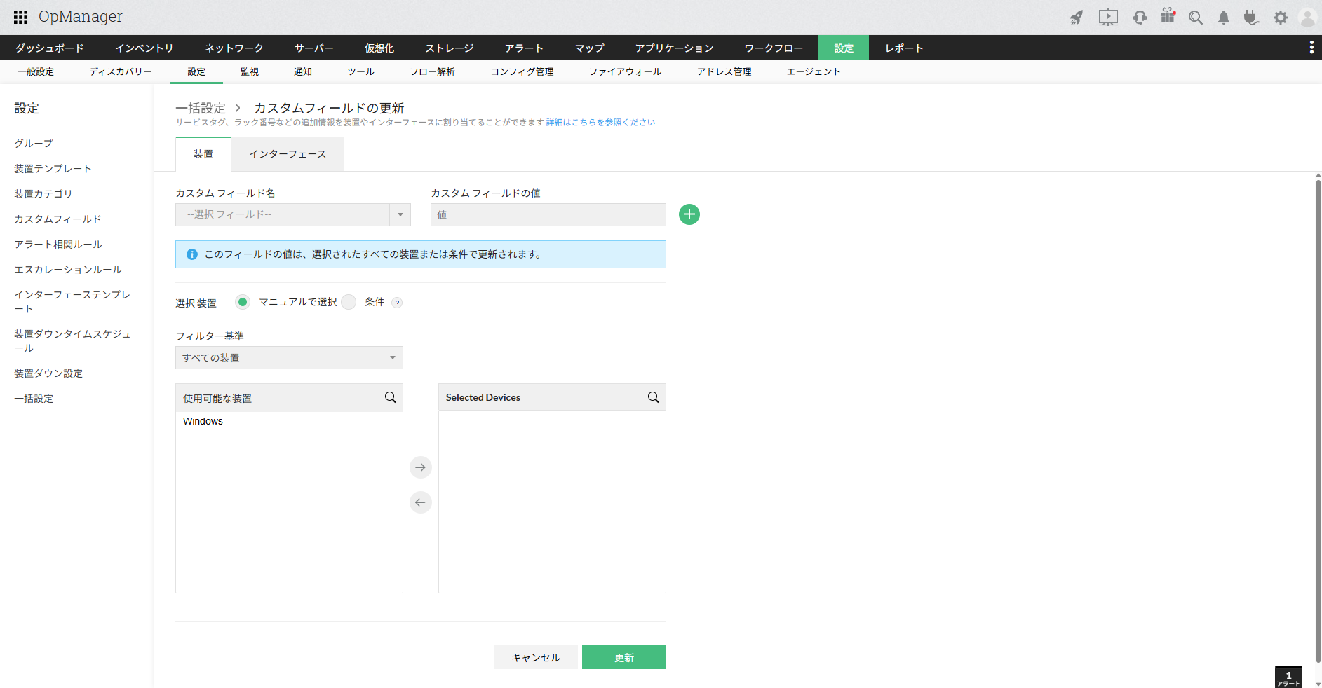 カスタムフィールドを更新する対象の装置/インターフェースを選択します。
