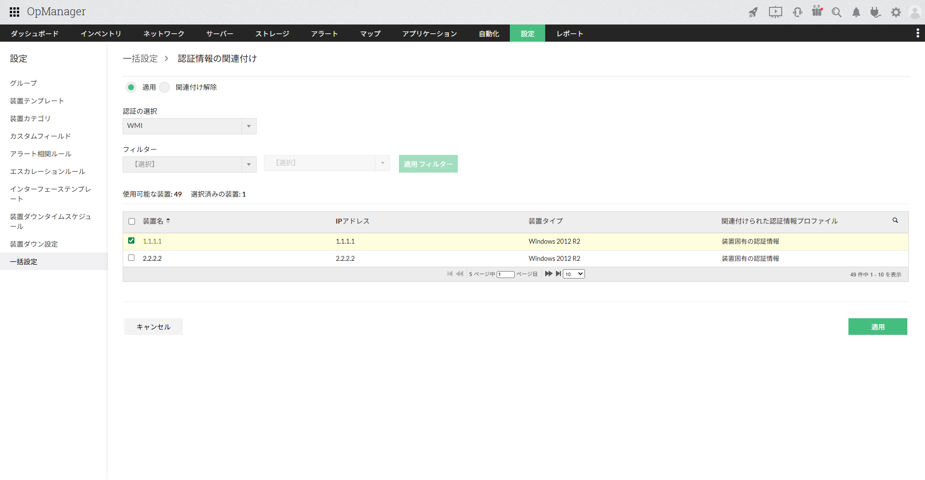 - 設定を行う装置のチェックボックスにチェックを入れ、[適用]をクリックします。