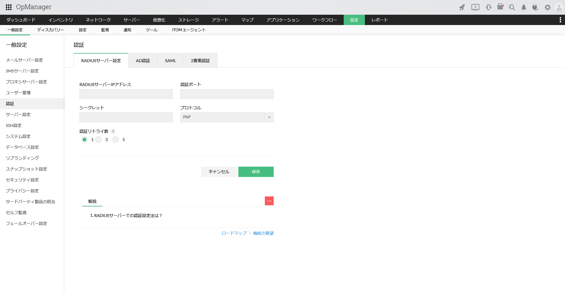 - [設定]→[一般設定]→[認証]→[RADIUSサーバー設定]に移動します。