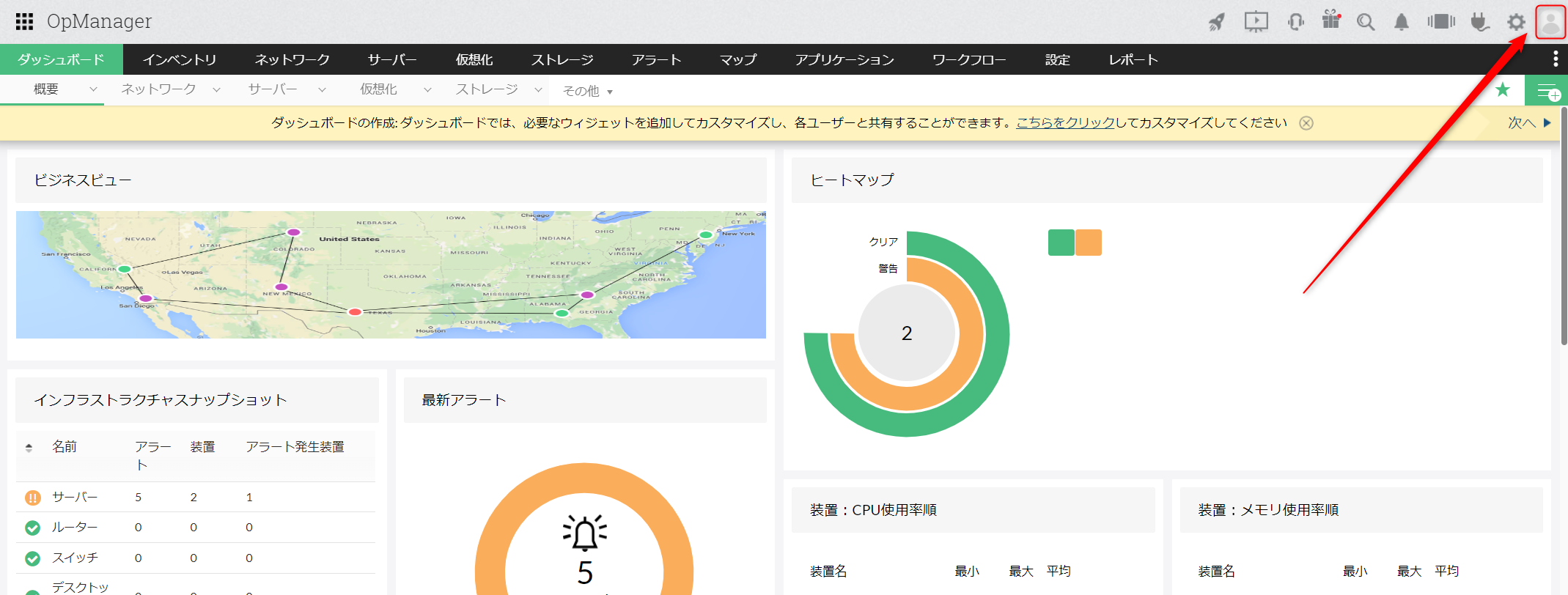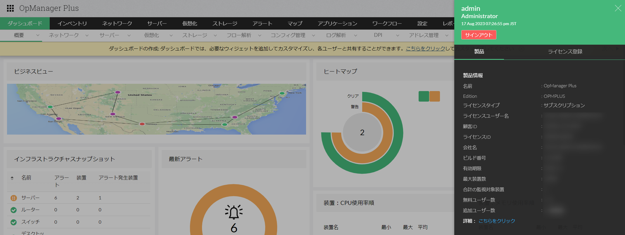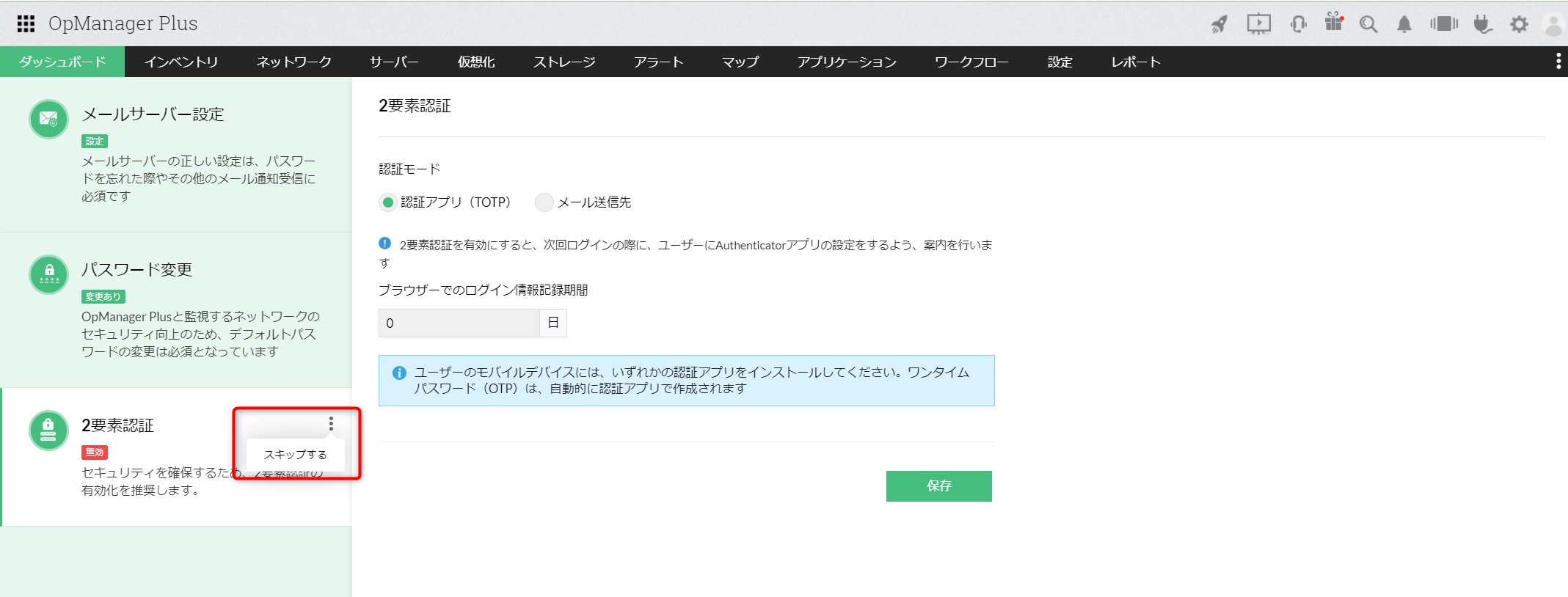 - 画面左上の製品名をOpManager Plusに変更する場合、サービスを再起動するか、リブランディング設定を行います。