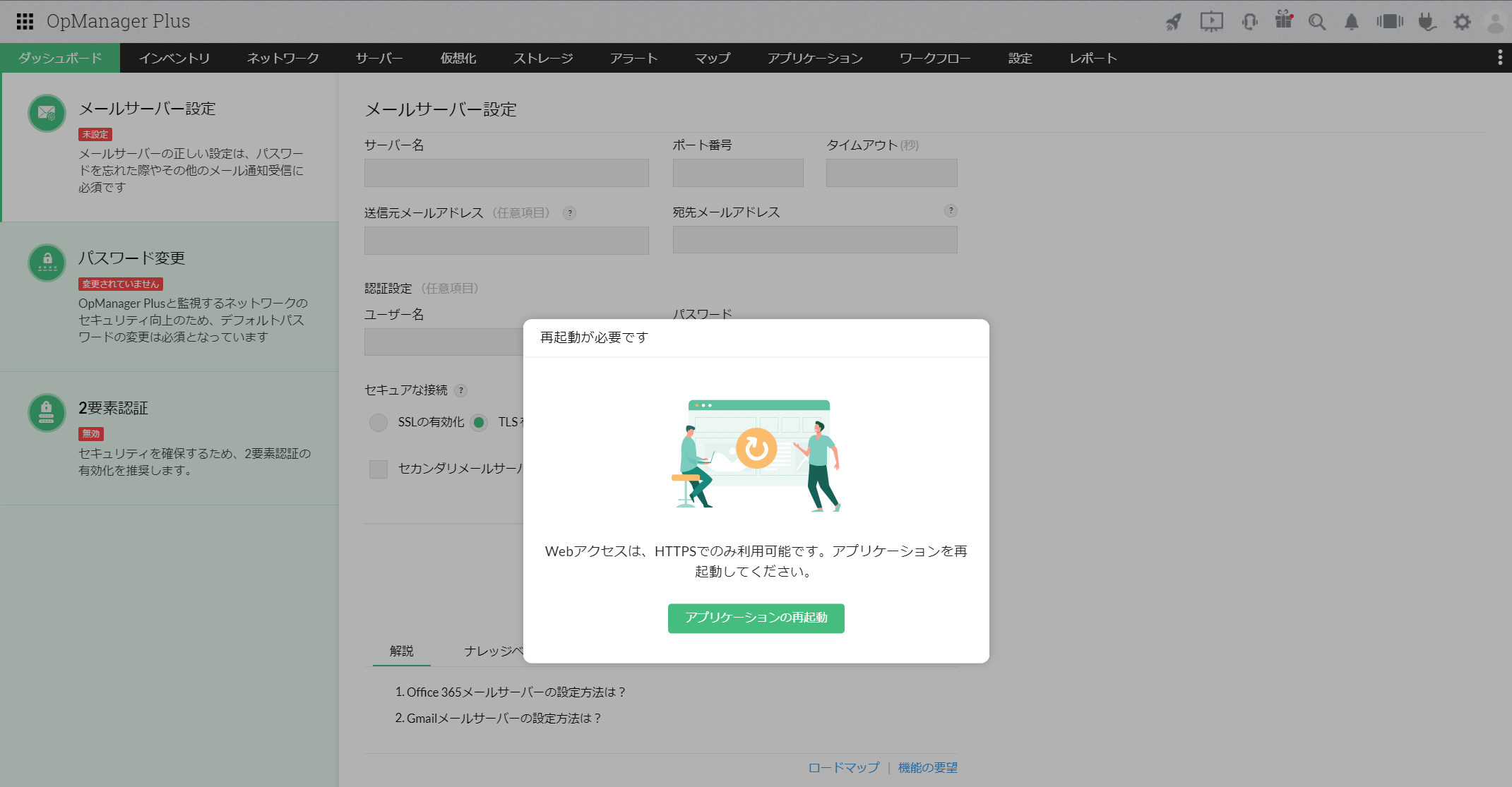 - HTTPS通信を有効化していない場合、HTTPS通信の変更を強制するポップアップが表示され、製品の再起動が必要となります。