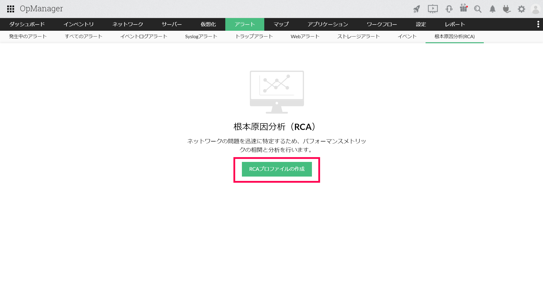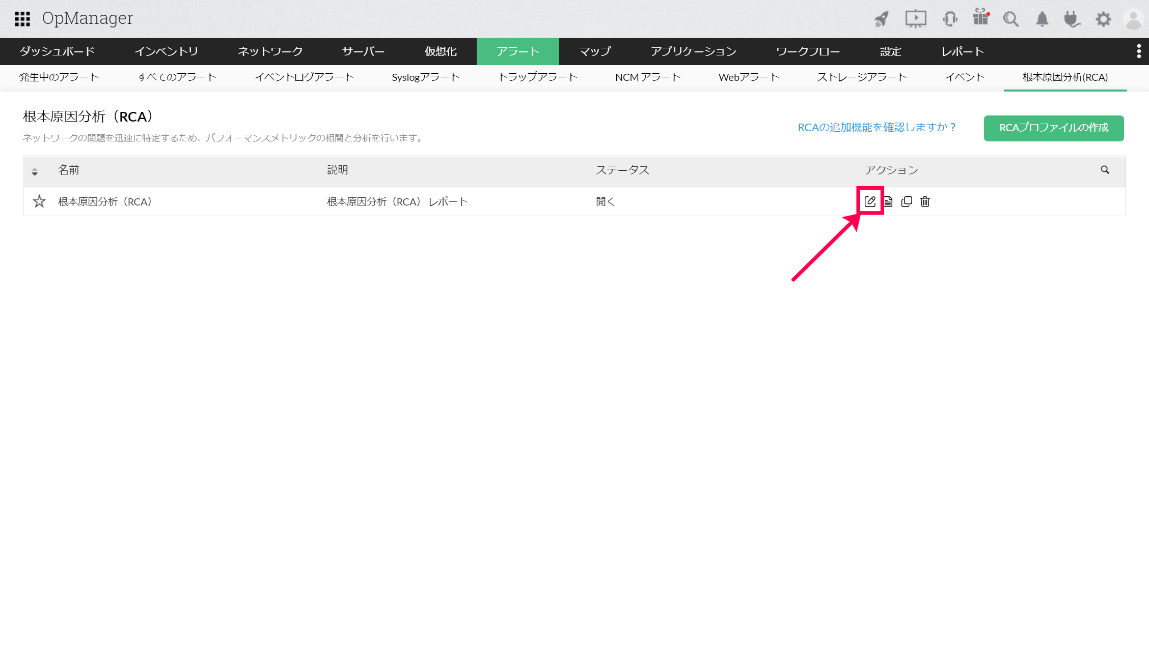 作成済みのRCAプロファイルを再度編集する場合は、[アラート]→[根本原因分析(RCA)]から、