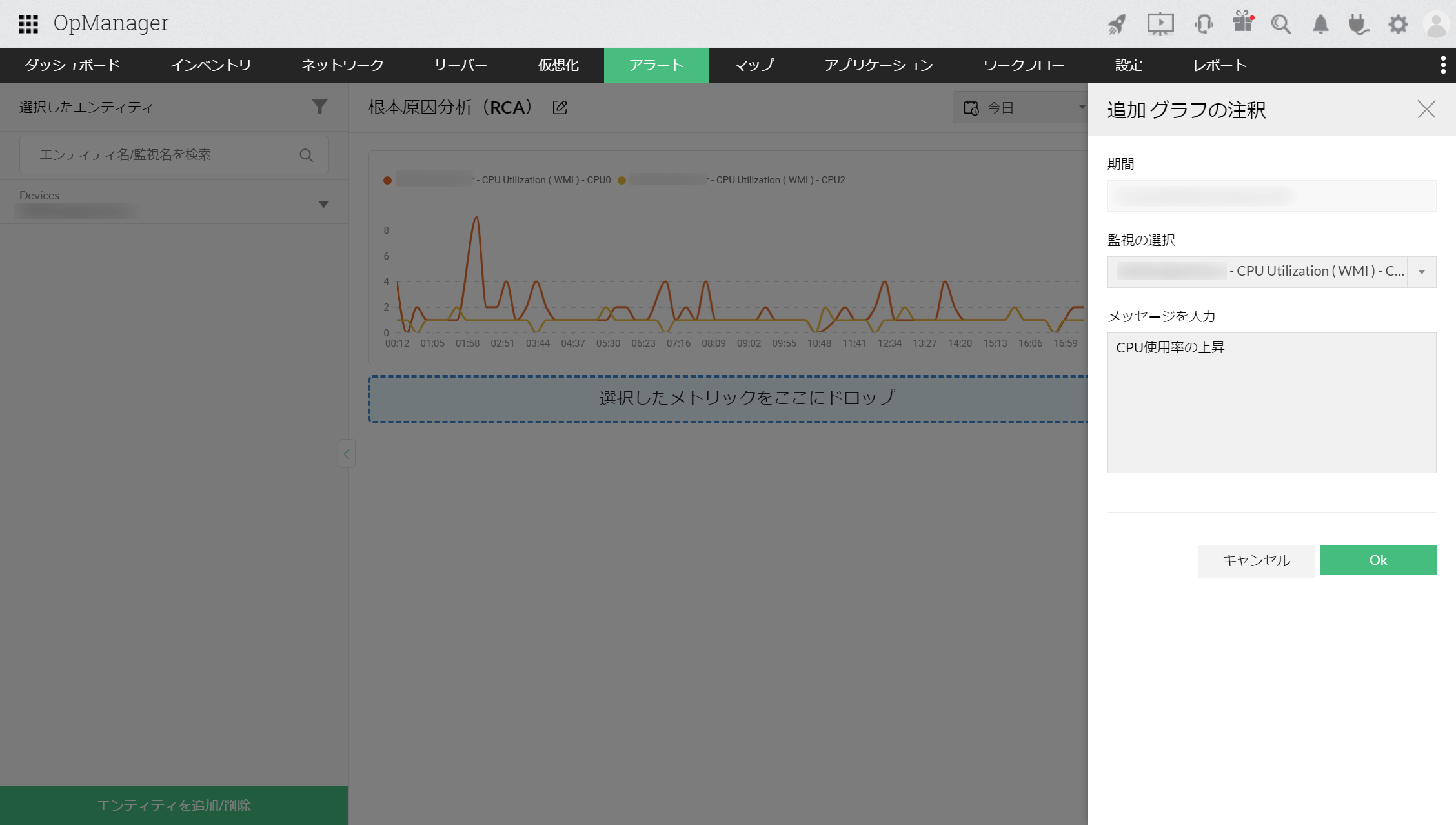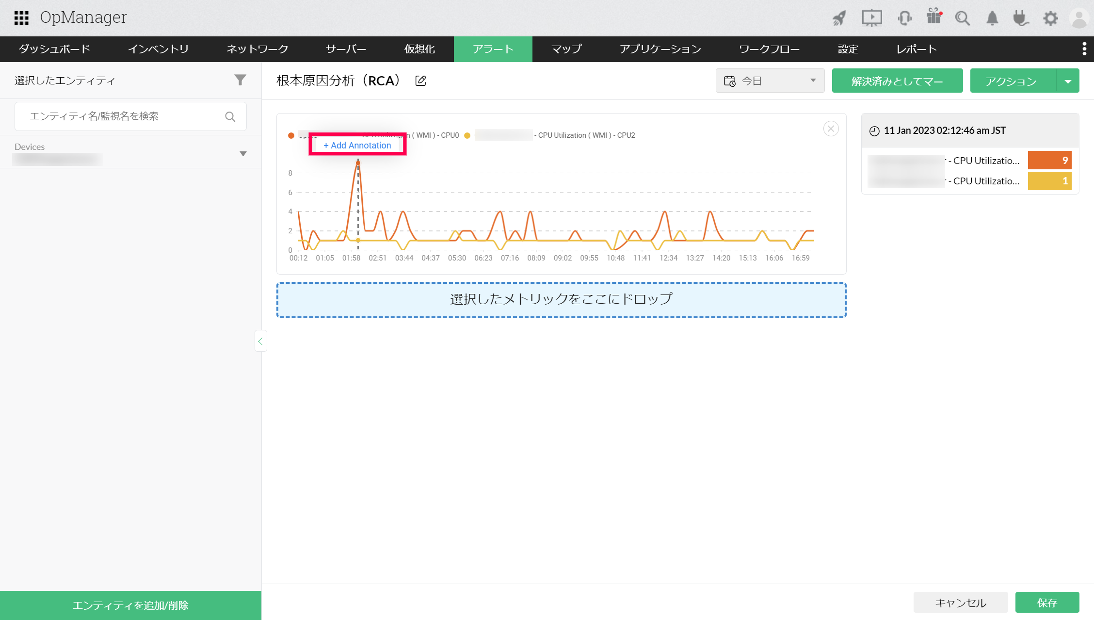 RCAプロファイル上のグラフから、リソース使用率上昇等の異常を確認した場合、その情報を注釈で追加することができます。
