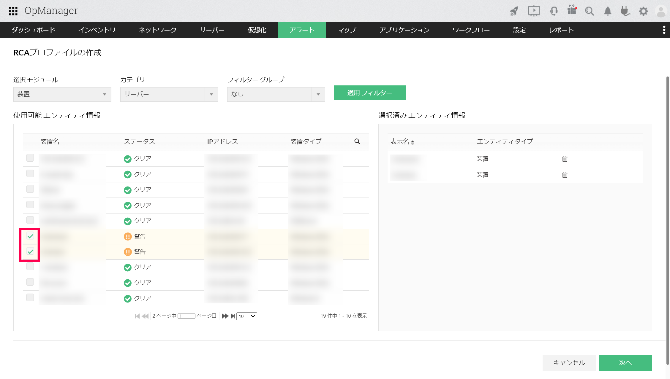 RCAプロファイルに含める監視の種類(装置、グループ、URL)を"選択 モジュール"から選び、プロファイルの対象とする要素の条件を設定後、"適用 フィルター"をクリックします。