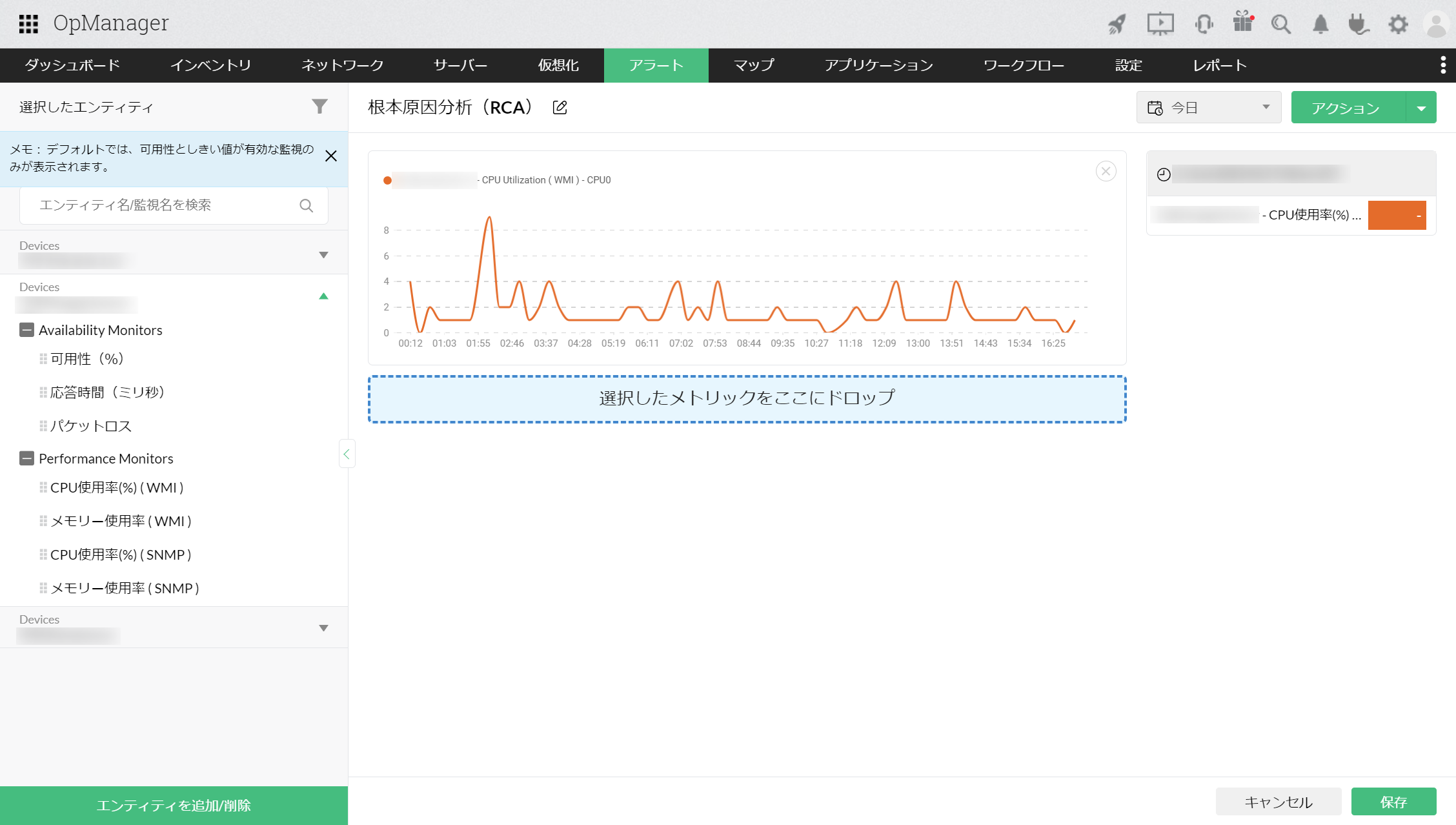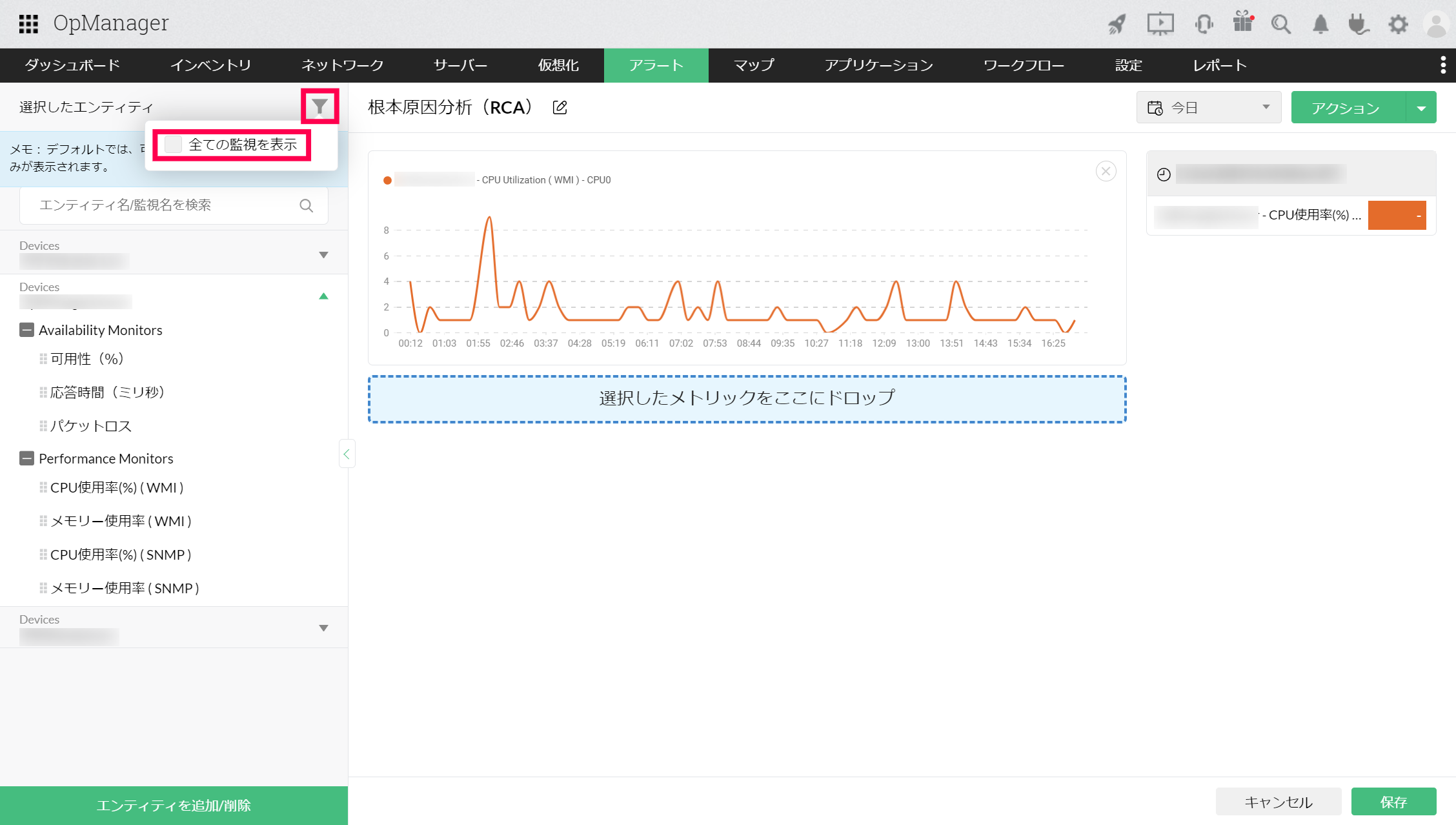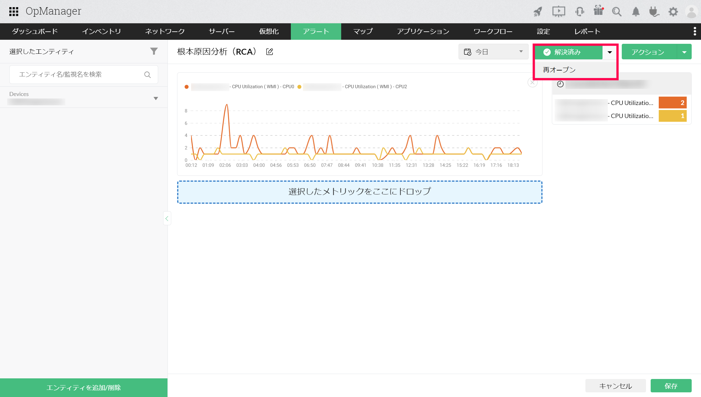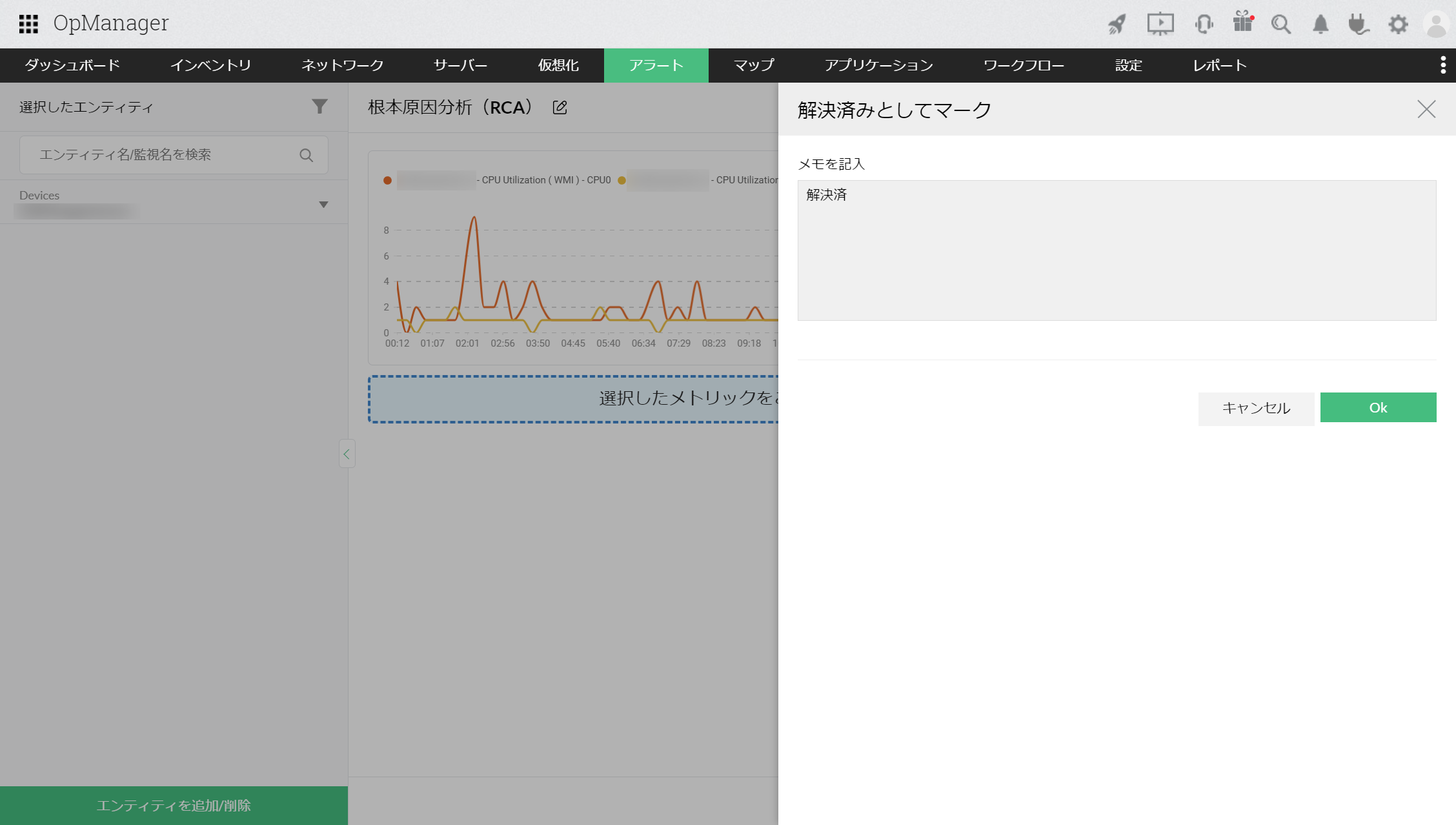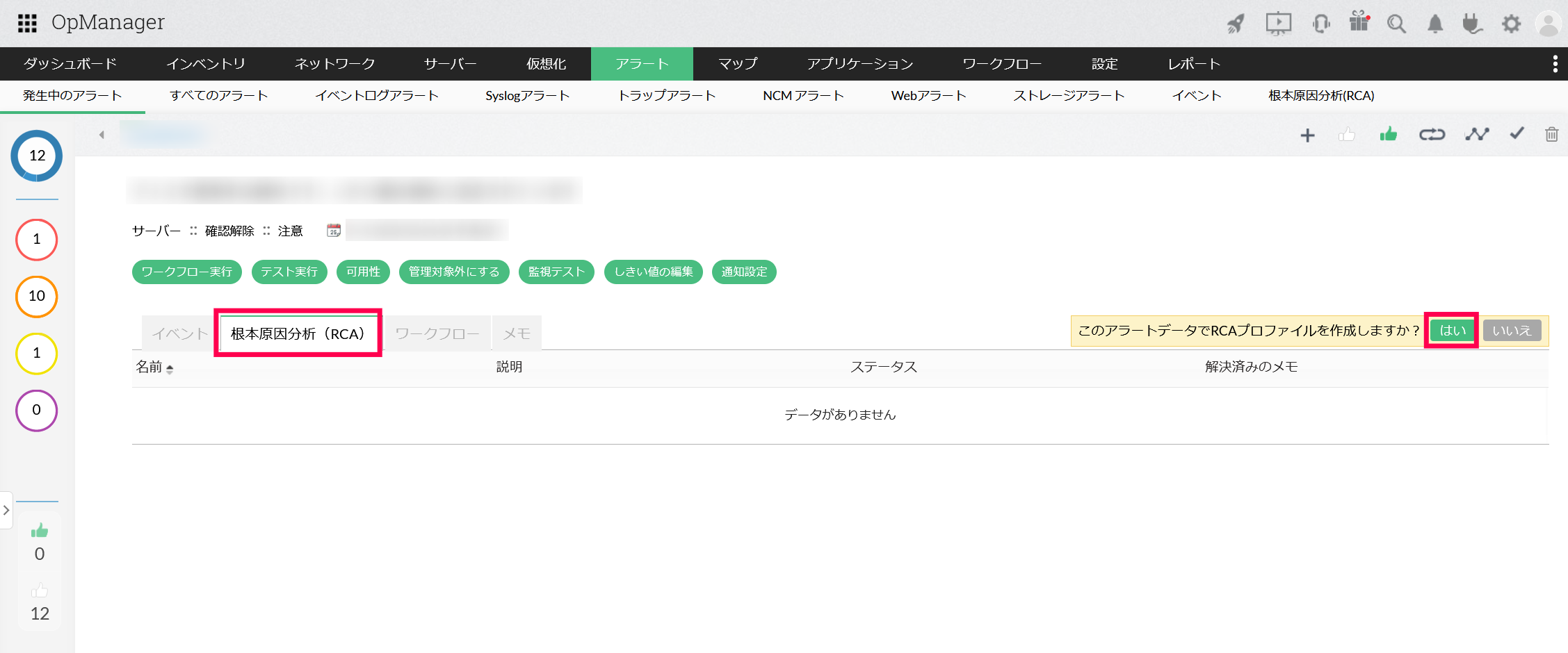 保存したRCAプロファイルは、[アラート]→[根本原因分析(RCA)]から確認できます。 -