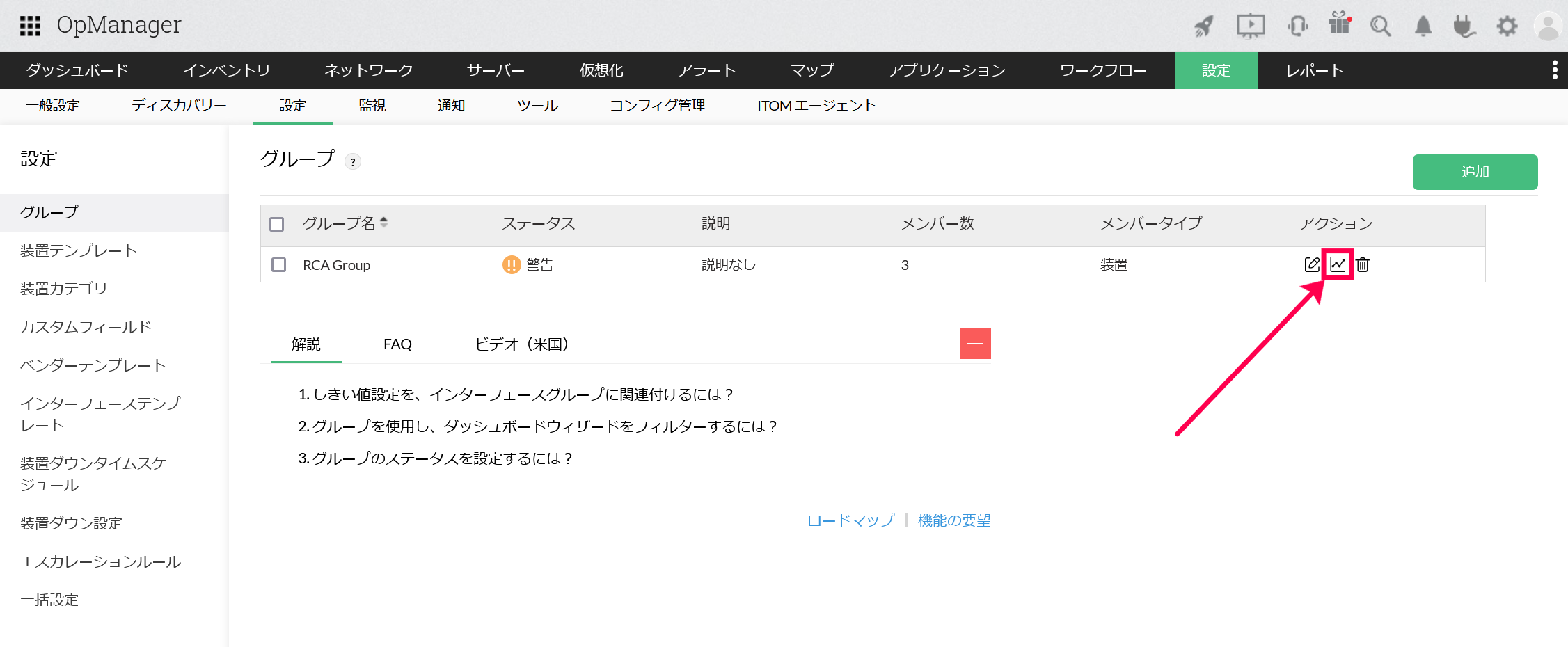 RCAプロファイルを作成したいグループの"アクション"配下のグラフマーク(RCAプロファイルの作成)をクリックします。