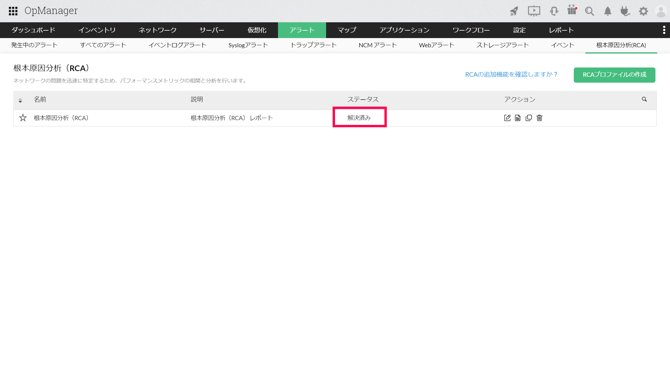 解決したRCAプロファイルは、そのステータスが"解決済み"に変更されます。