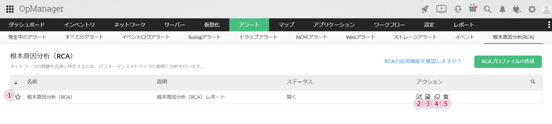 [アラート]→[根本原因分析(RCA)]で表示される既存のRCAプロファイル一覧から、以下のアクションが実行できます。