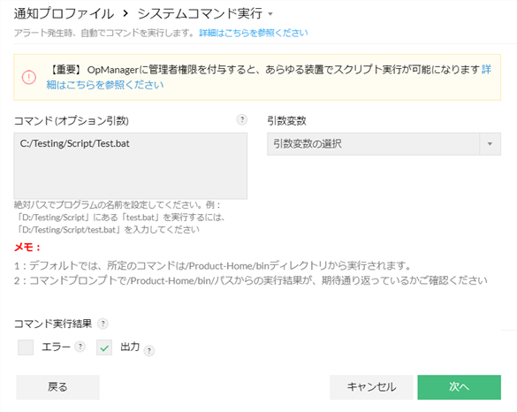 通知プロファイルのシステムコマンド実行では、アラートをトリガーとして任意のコマンドを実行できます。