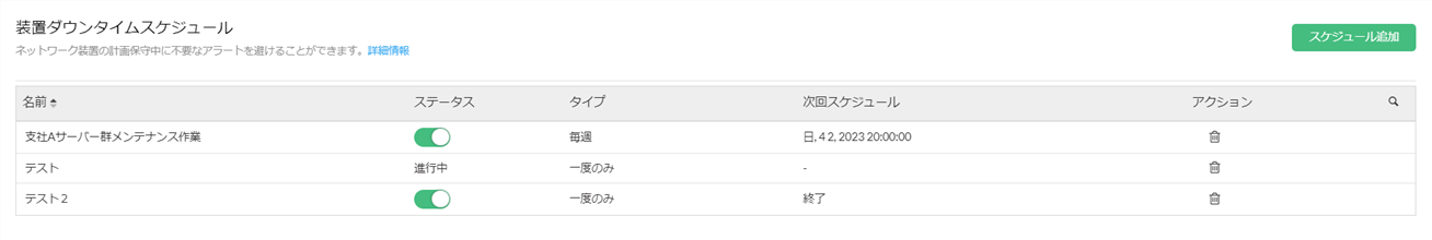 [ステータス]カラムのラジオボタンをクリックすることで、ダウンタイムスケジューラーの有効/無効を切り替えられます。