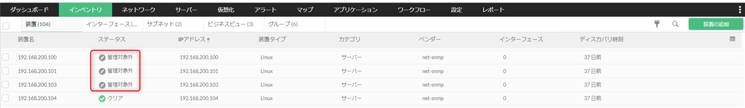 ダウンタイムスケジューラーの対象の装置は、指定した期間中[管理対象外]のステータスになり、全ての監視が停止します。