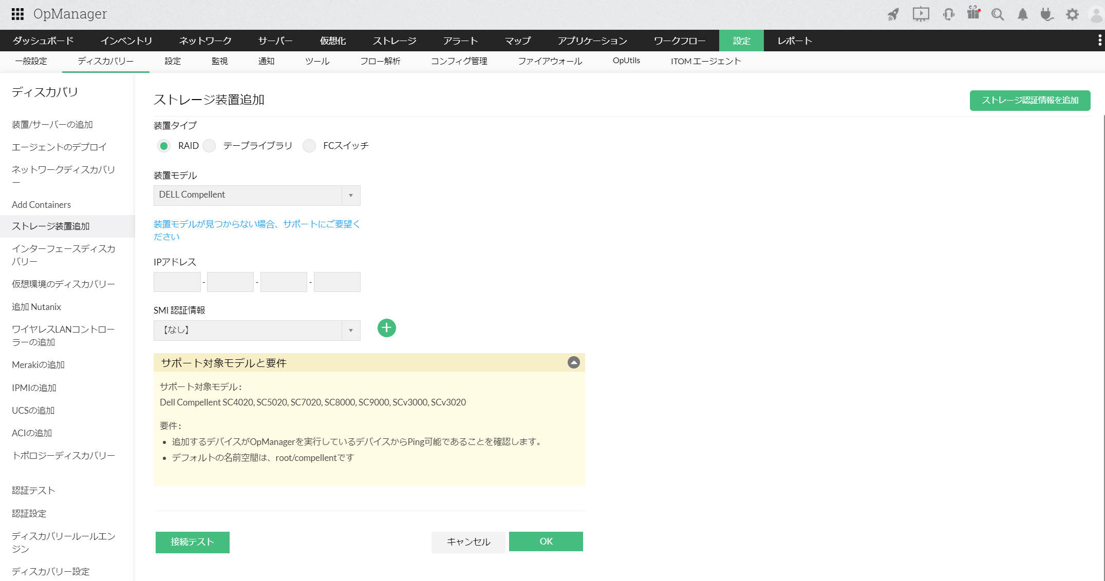 - [設定]→[ディスカバリー]→[ストレージ装置追加]をクリックします。