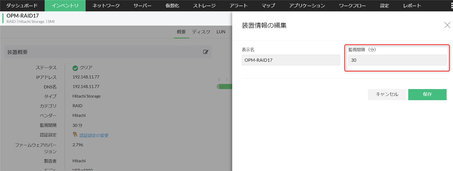 ディスカバリーしたストレージ装置の監視間隔は以下の手順で変更可能です。