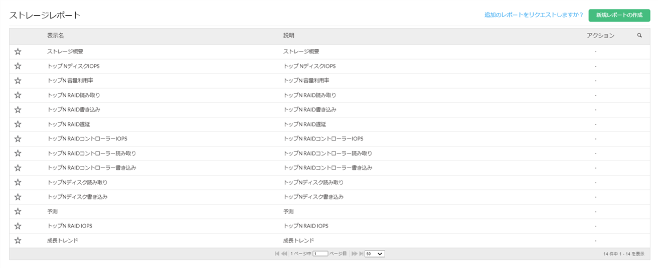 [レポート]→[OpManager]→[ストレージレポート]より、ストレージ監視に関する各種レポートの閲覧、出力が可能です。