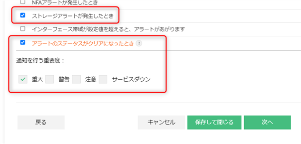 アラートを外部へ通知する場合、通知プロファイル設定の条件指定で[ストレージアラートが発生した時]と、