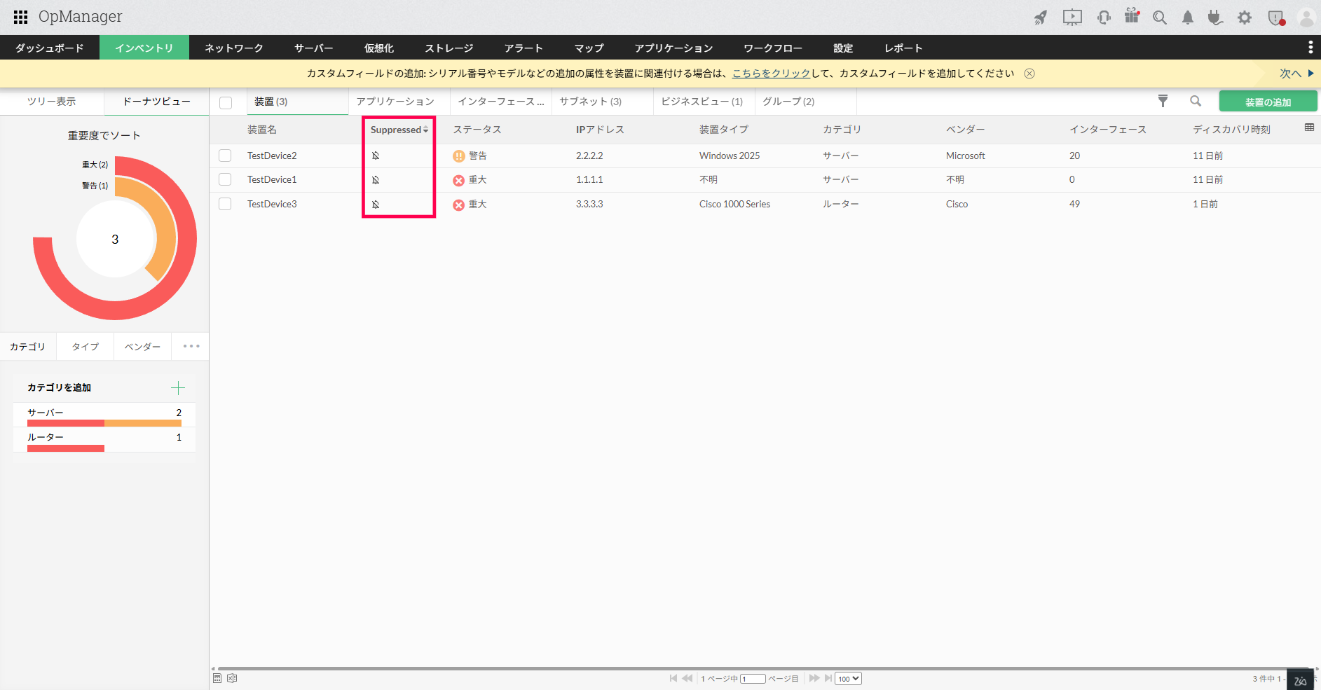 アラートが抑止されている装置/インターフェースは、[インベントリ]ページの「Suppressed」フィールドにアラート抑止アイコン