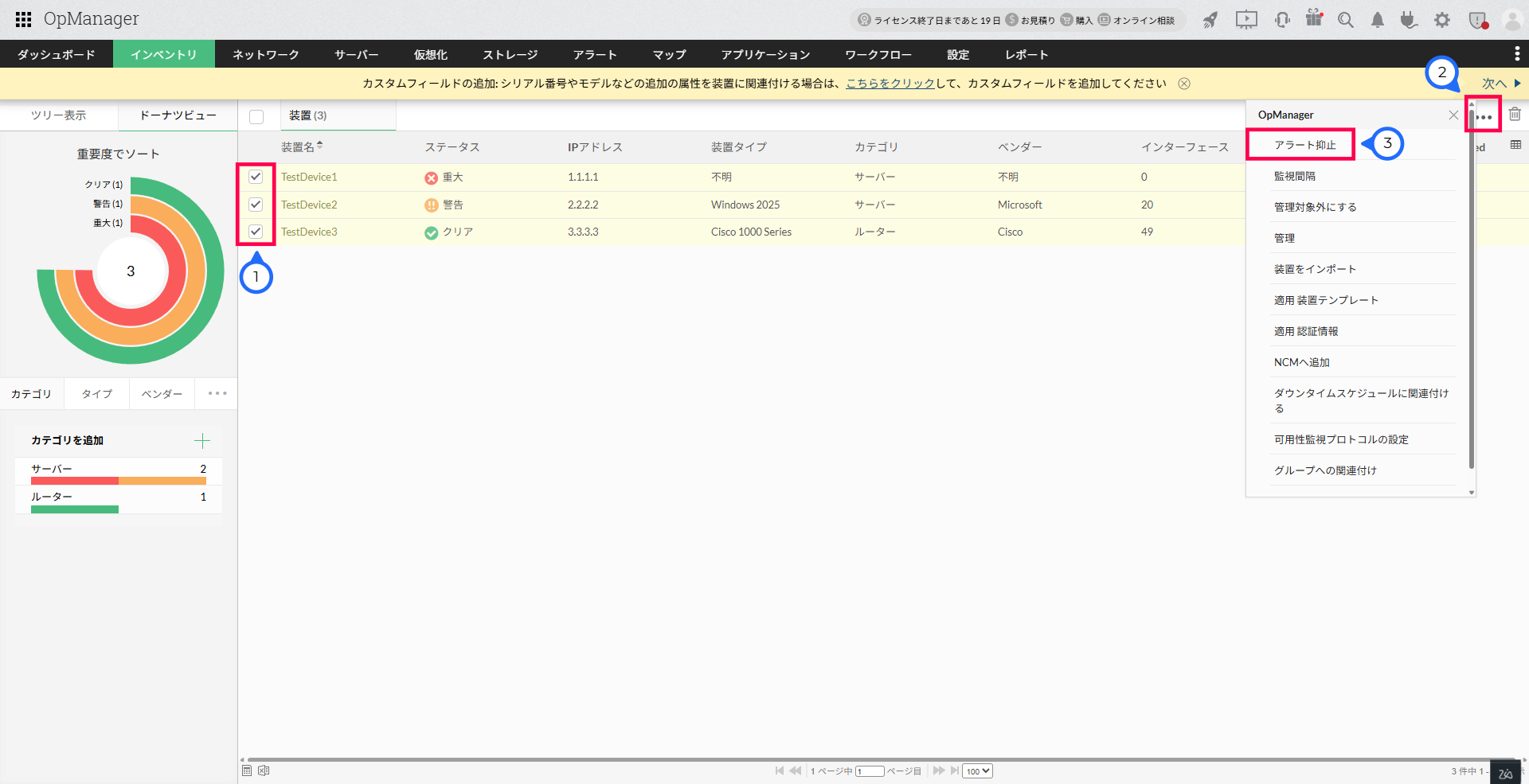 - 画面右上の「アクション」から、[アラート抑止]を選択します。