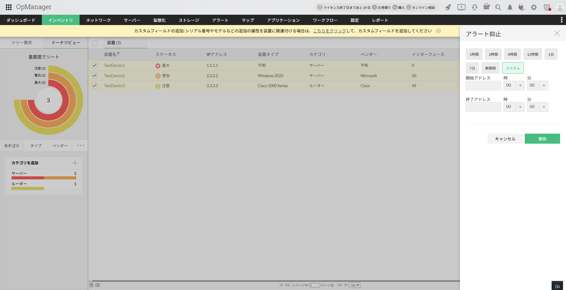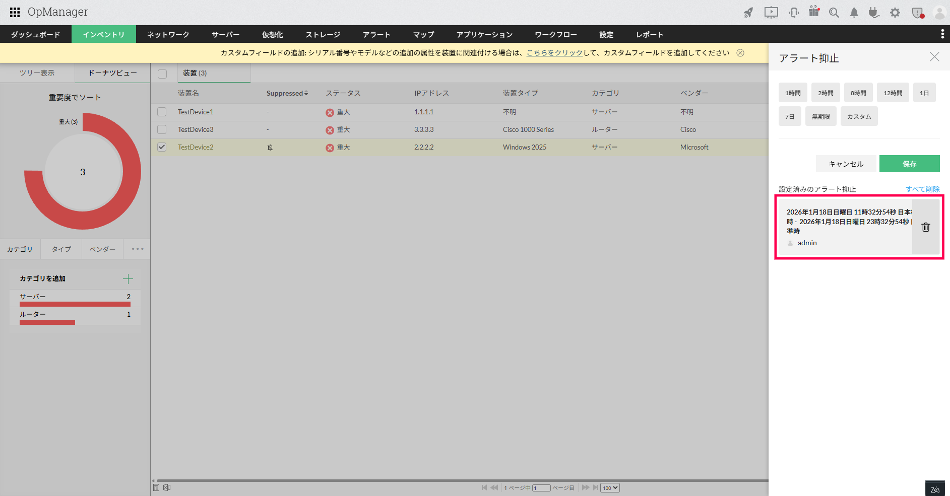 画面右側に表示されるアラート抑止設定から、アラート抑止の期間を設定します。