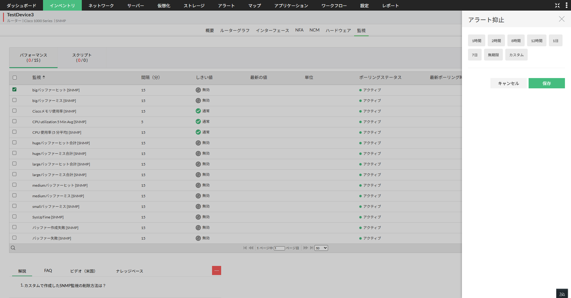 アラート抑止は、装置に設定されている個別の監視項目に対しても設定できます。手順は以下です。
