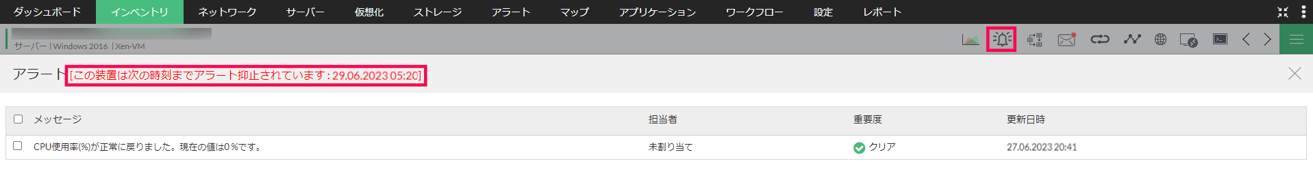 アラートが抑止されている装置の概要ページで、画面右上のアラートアイコン